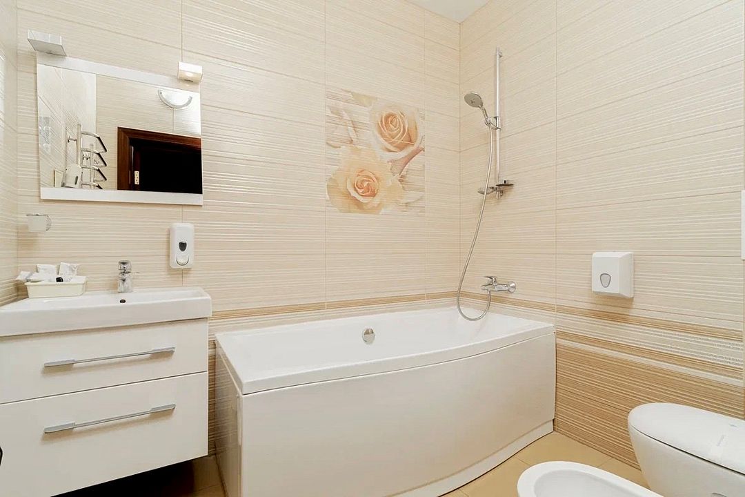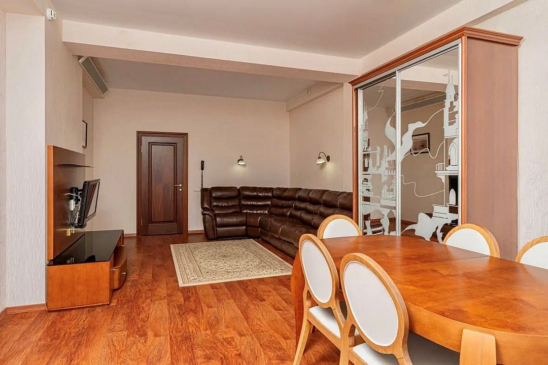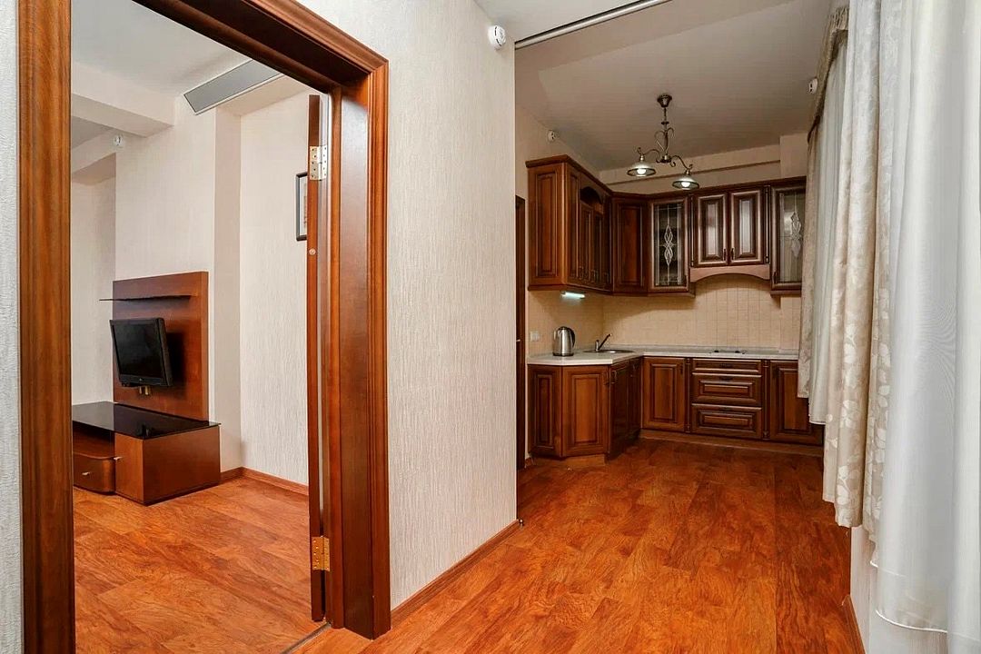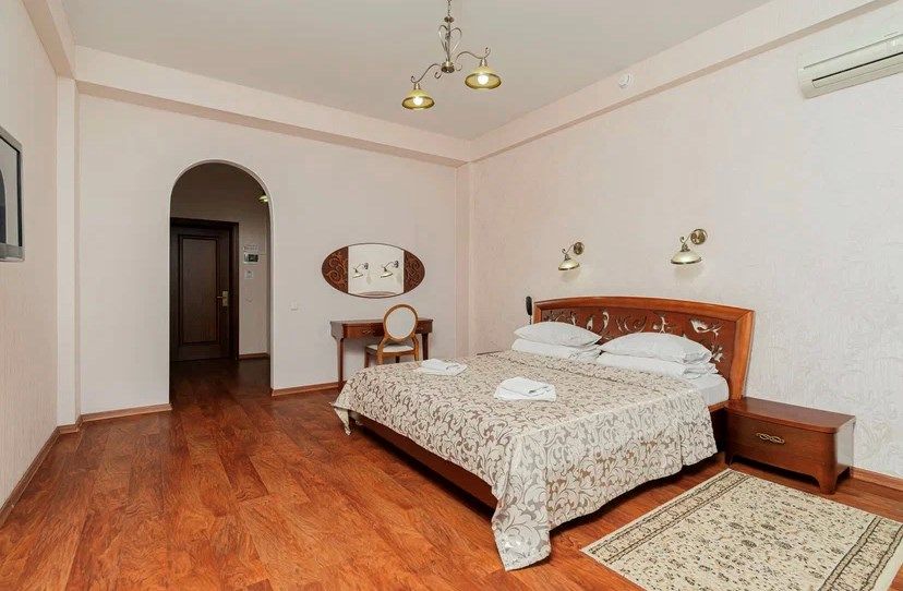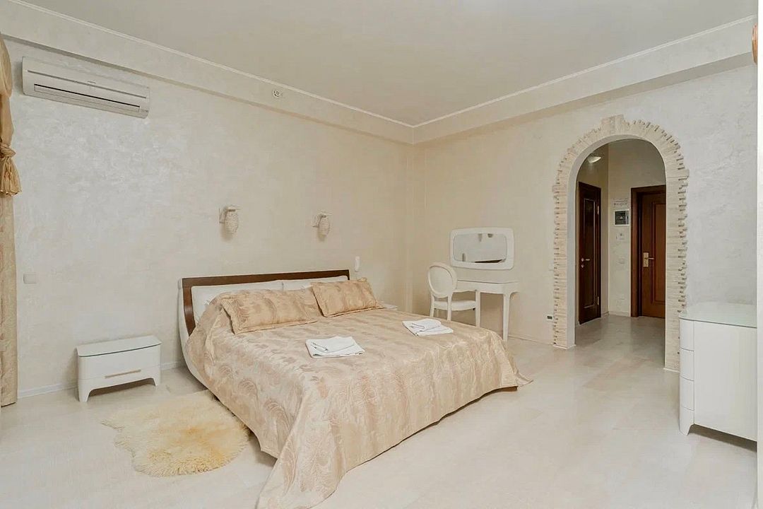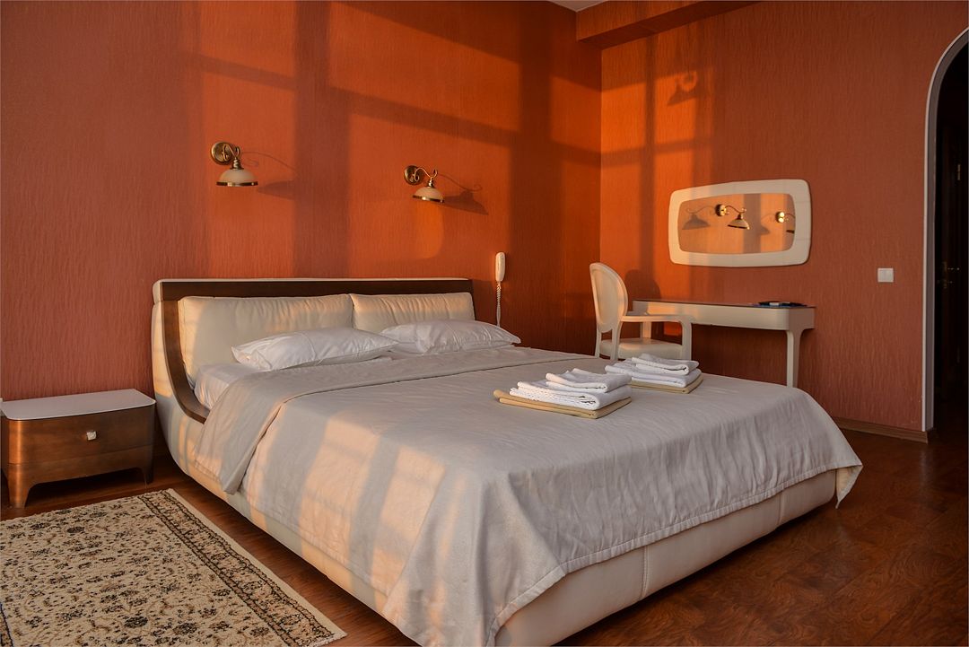 Просторный двухкомнатный номер с гостиной, спальной комнатой и кухней, площадью 60м2 с большим балконом выход на который из гостиной и спальной комнат. Кухня оснащена современной встроенной техникой и укомплектованная необходимым набором посуды. В гостиной большой обеденный стол, что позволяет гостям комфортно принимать пищу в номере. Ванная комната, оборудована ванной больших размеров. Максимальный комфорт, мечта, которая стала реальностью. Размещение детей старше 12 лет.Услуги и удобства