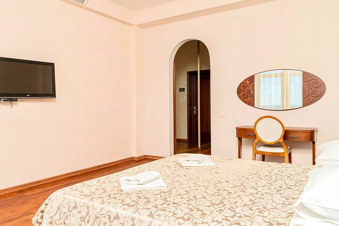 два телевизора, Wi-Fi, холодильник, кондиционер, фен, электронные замки, обогреватель, ванна, биде, халаты, банные полотенца, пляжные полотенца, тапочки, гигиенические средства, балкон с красивым видом, двуспальная кровать, диван, стулья, шкаф для одежды, журнальный столик, обеденный стол, зеркало, ковер, эксклюзивная мебель, две комнаты, кухня, чайный набор, набор посуды, сейф, чайник, мягкая мебель, гостиная зона, вид на море, кулер на этаже, ламинат, стаканы, кухонная утварь, столовые приборы, туалетный столик, панорамные окна, сушилка для белья, внутренний телефон, телевизор с плоским экраном, мини-холодильник, шкаф-купе, номер для некурящих, пуфикВ гостиничном номере