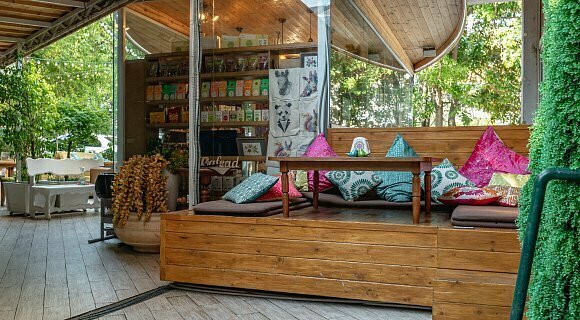 На 1 этаже расположено вегетарианское кафе «Прасад», которое с легкостью изменит Ваше представление о вкусной и здоровой пище.