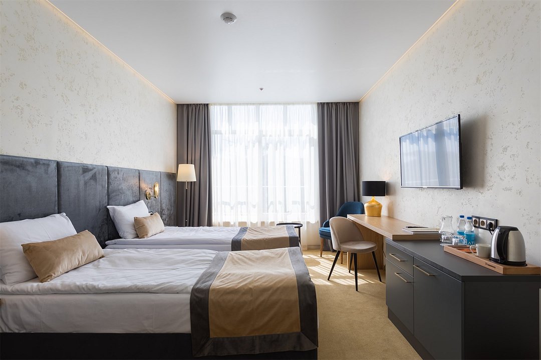 кабельное телевидение, Wi-Fi, интернет, телефон, светильник, настольные лампы, фен, электронные замки, ванная комната, душевая кабина, теплый пол, банные принадлежности, халаты, банные полотенца, пляжные полотенца, тапочки, гигиенические средства, косметические средства, две односпальные кровати, гипоаллергенное белье, шкаф для одежды, вешалки, журнальный столик, письменный стол, багажная тумба, зеркало, пуфики, сейф, косметическое зеркало, питьевая вода, ковровое покрытие, отопление, душ, вид на город, кулер на этаже, кресло, вид во двор, стаканы, стул, туалетные средства, телевизор с плоским экраном, мини-холодильник, шкаф-купе, гостиничная парфюмерия, номер для некурящих, фанкойл, пуфик, гигиенический душ, чайная станция, без питомцевВ гостиничном номере