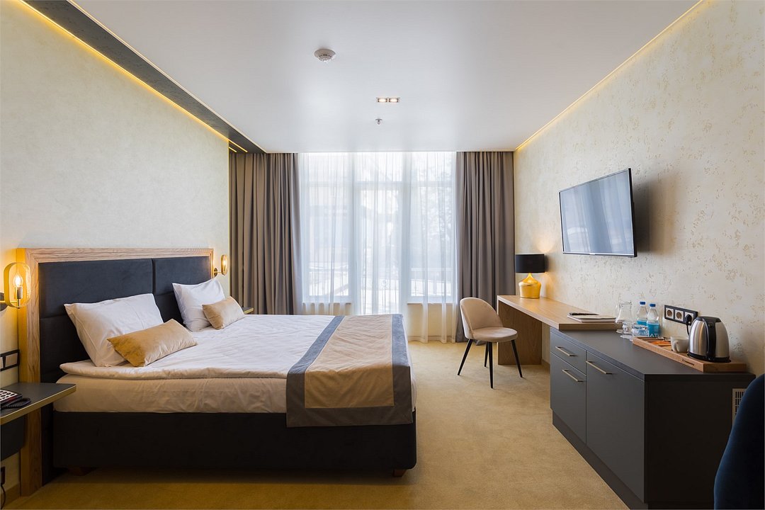 Современный номер с двуспальной кроватью для тех, кто ценит удобство и комфорт. Продуманный дизайн, качественная отделка и профессиональное оснащение служат основой для вашего отдыха. Дополнительное место представлено в виде раскладного мини-дивана.Услуги и удобства