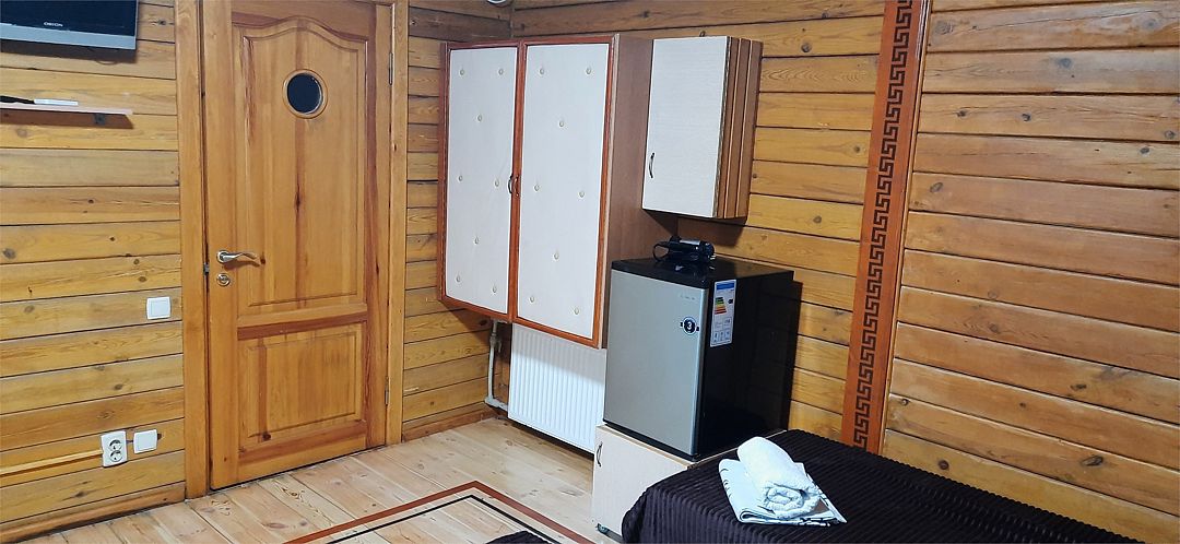 Однокомнатный полулюкс на 2осн.(+2доп. человека) в номере. В каждом полулюксе имеется: 2 кровати односпальные (сдвинутые используются как двухспальные), двухспальный раскладной диван, стол, пуфик, санузел с душем и феном, кондиционер, чайник, посуда, телевизор. Вода горячая и холодная круглосуточно. Балкон, на балконе столик и три стула. Спаренные 2 полулюкса могут использоваться как двухкомнатный номер Люкс «Княжий» на 4осн.(+4доп. человек.)Услуги и удобства