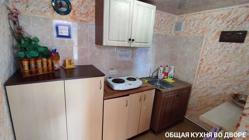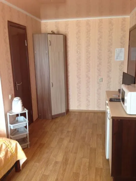 В каждом номере есть небольшая прихожая, в которой оборудовано кухонное место с холодильником, микроволновой печью, мультиваркой, электрочайником и набором посуды. Из прихожей отдельно вход в санузел.