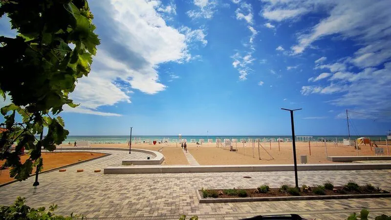 Удобный подход к морю, дно пологое без камней. Пляж полностью оборудован для вашего отдыха: шезлонги, зонты, водные аттракционы, детские горки, кафе.