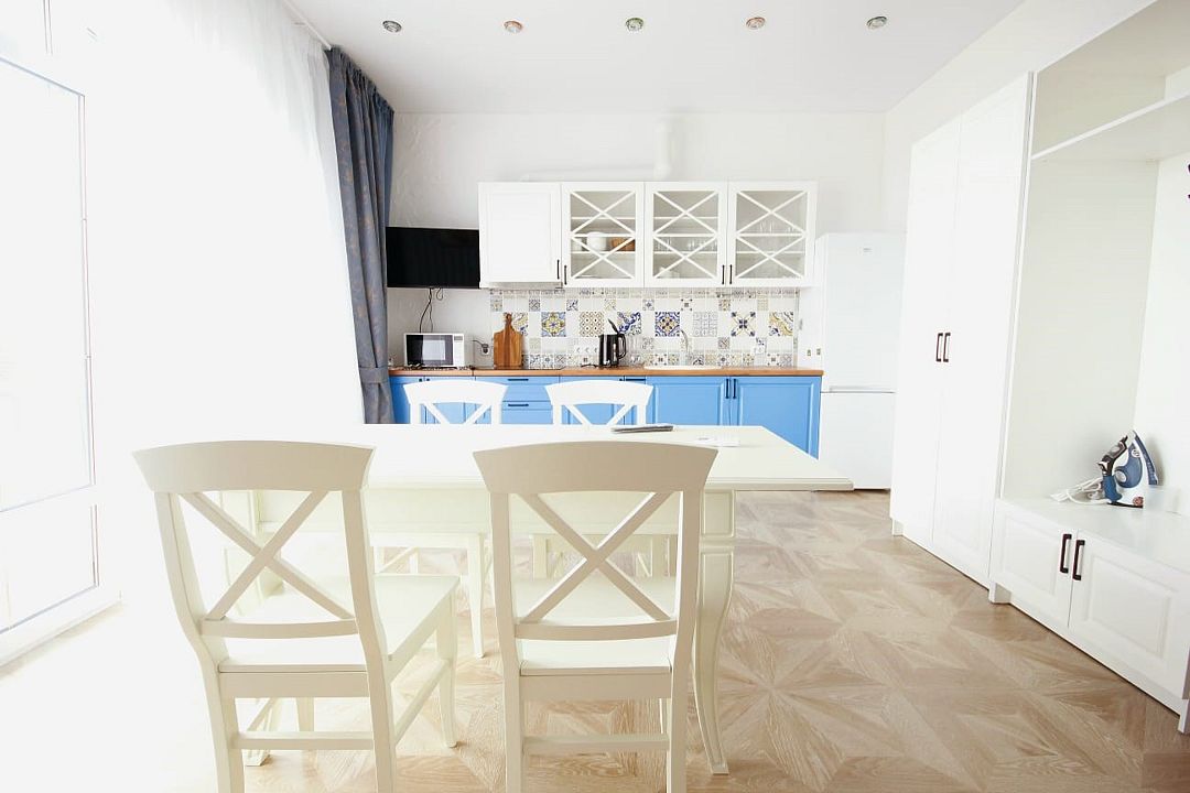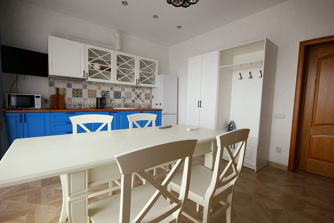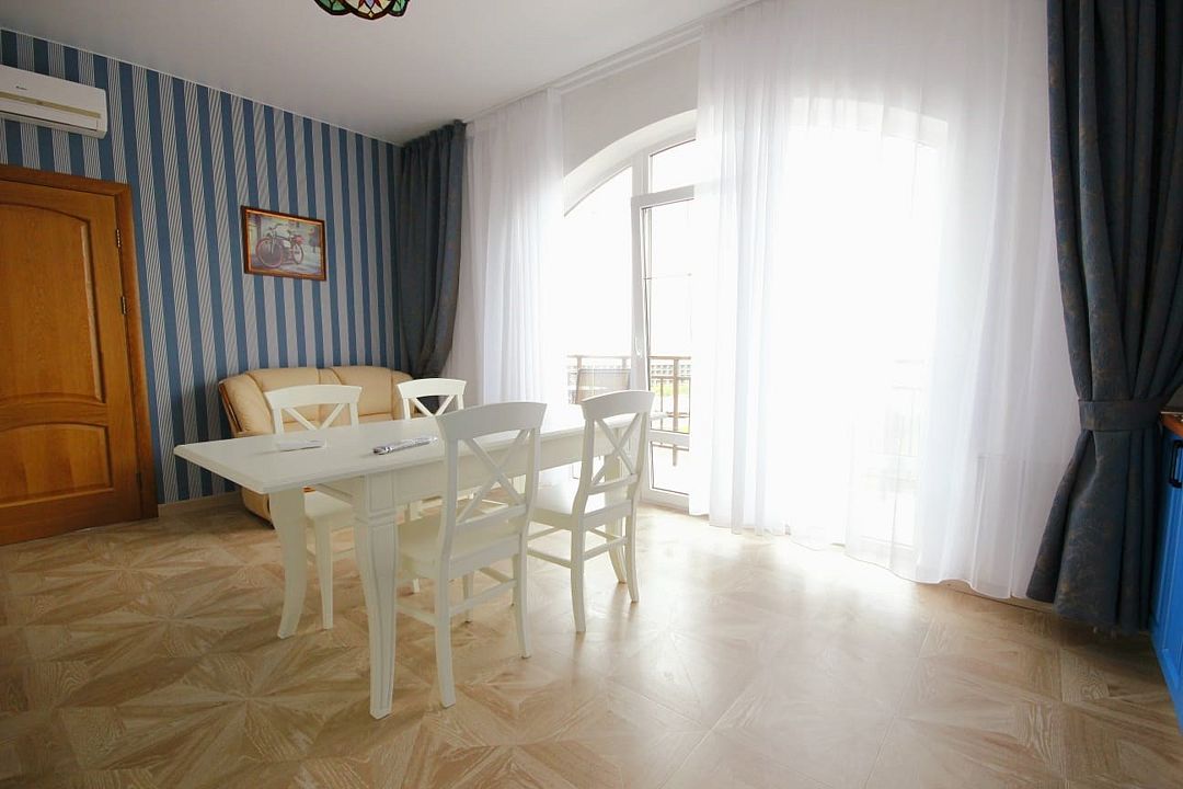 Просторный, светлый номер со множеством окон, после дизайнерского ремонта. В этом номере Вам будет очень комфортно трапезничать с друзьями за большим обеденным столом, наслаждаясь живописными пейзажами.