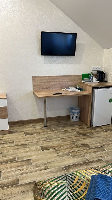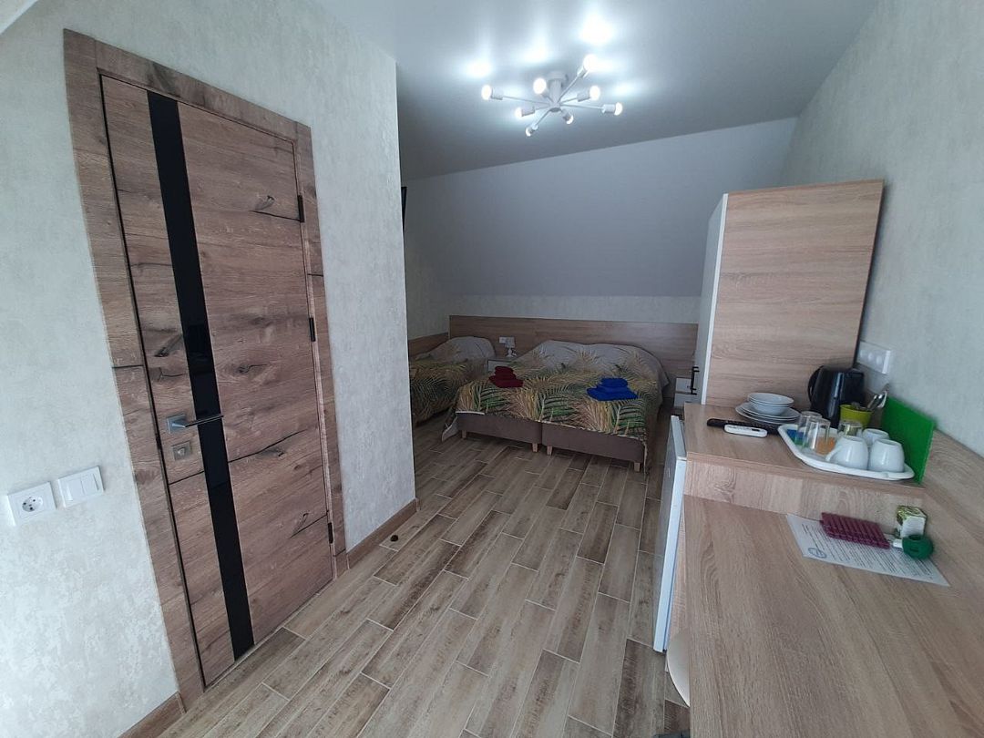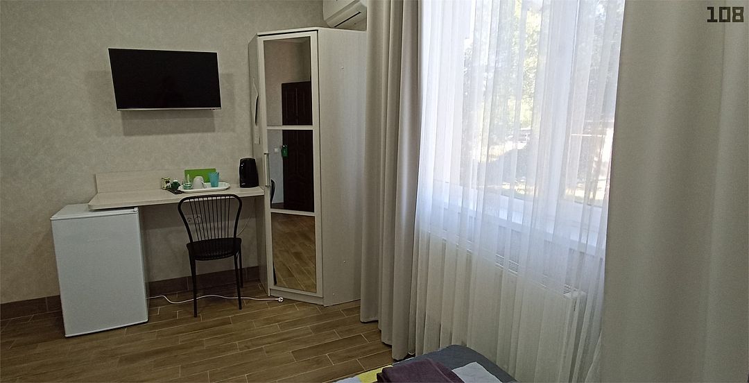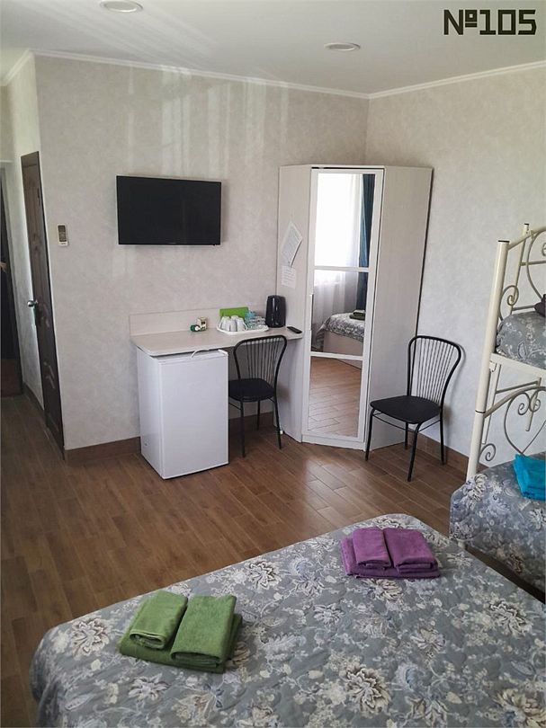 Семейный номер на 4 этаже с 1 односпальной кроватью и 1 двуспальной кроватью, подходит для 1-3 человек, оборудован всем необходимым для комфортного проживания. В номере предусмотрены: шкаф для одежды, зеркало, кондиционер, телевизор, Wi-Fi, холодильник, чайник, полотенца, санузел. На этаже расположены: гладильная доска и утюг, микроволновая печь, кулер с водой (в летнее время). Предоставляется стирка за дополнительную плату. На территории гостиницы имеется общая парковка с ограниченным числом парковочных мест. Бронирование мест не предусмотрено и невозможно.Услуги и удобства