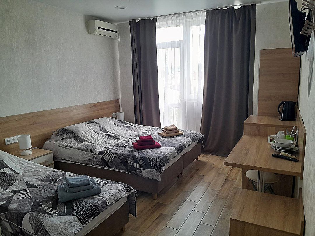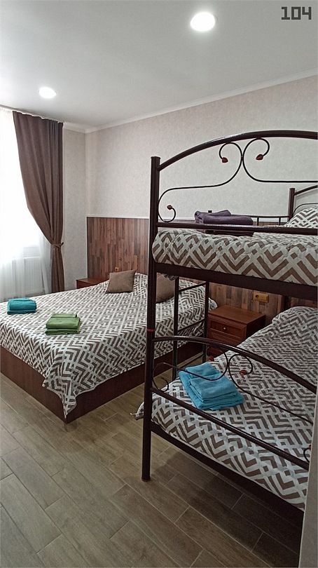 Семейный номер с 1 двуспальной и 1 двухъярусной кроватью. Прекрасно подходит для размещения 1-4 человек, оборудован всем необходимым для комфортного проживания. В номере предусмотрены: шкаф для одежды, зеркало, кондиционер, телевизор, Wi-Fi, холодильник, чайник, полотенца, санузел. ЗАБРОНИРОВАТЬ НОМЕР С БАЛКОНОМ МОЖНО ТОЛЬКО ПО ТЕЛЕФОНУ, ПРИ НАЛИЧИИ СВОБОДНЫХ! На этаже расположены: гладильная доска и утюг, микроволновая печь, кулер с водой (в летнее время). Предоставляется стирка за дополнительную плату. На территории гостиницы имеется общая парковка с ограниченным числом парковочных мест. Бронирование мест не предусмотрено и невозможно.Услуги и удобства