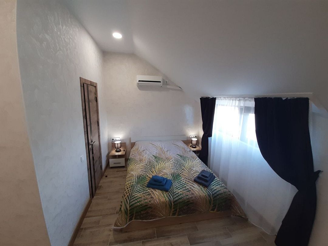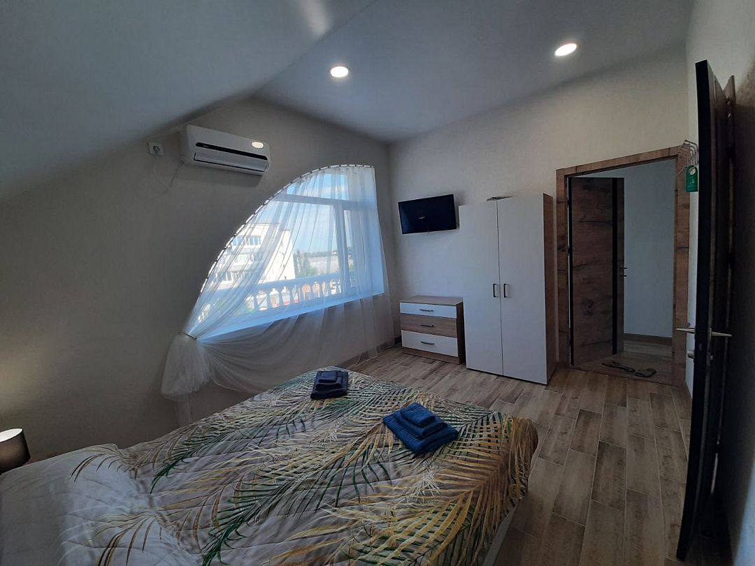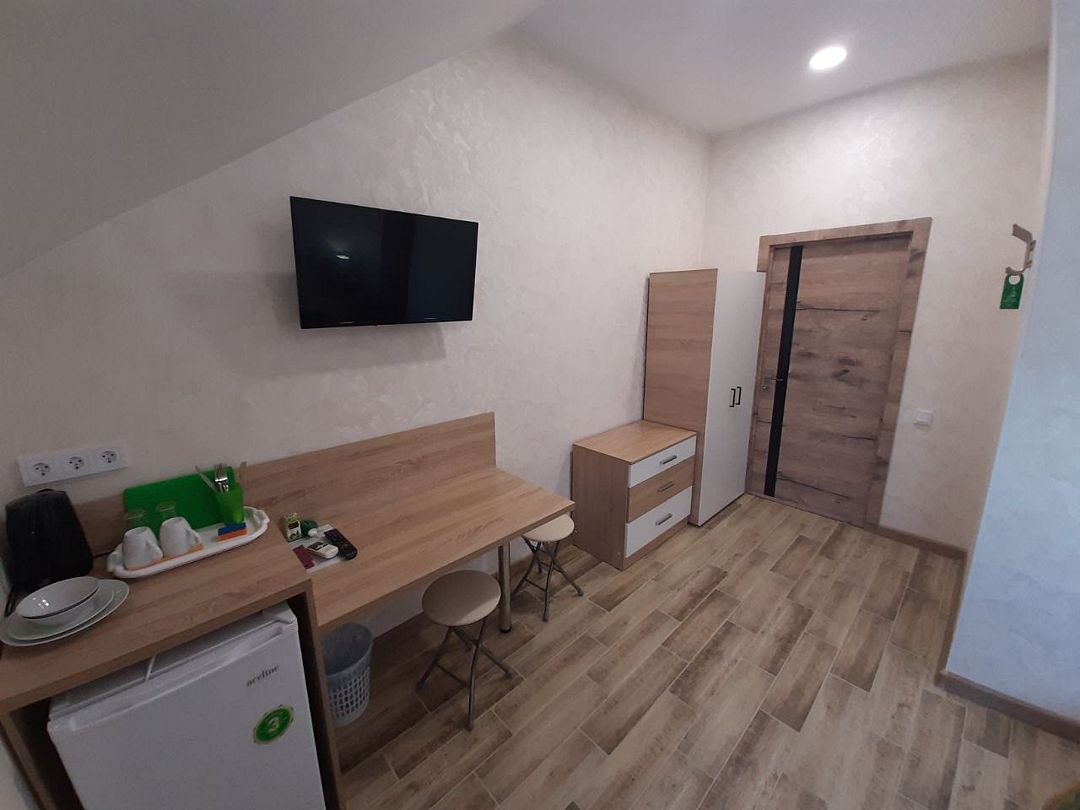 телевизор, Wi-Fi, холодильник, кондиционер, фен, душевая кабина, санузел, двуспальная кровать, тумбы, стулья, вешалки, набор посуды, чайник, унитаз, раковина, кулер на этаже, плиточное покрытие, стаканы, столовые приборы, стол, туалетные средства, москитная сетка, шкаф-купе, мансардные окна, номер для некурящих, фумигатор, уборка номера, услуги прачечной (платно)В гостиничном номере