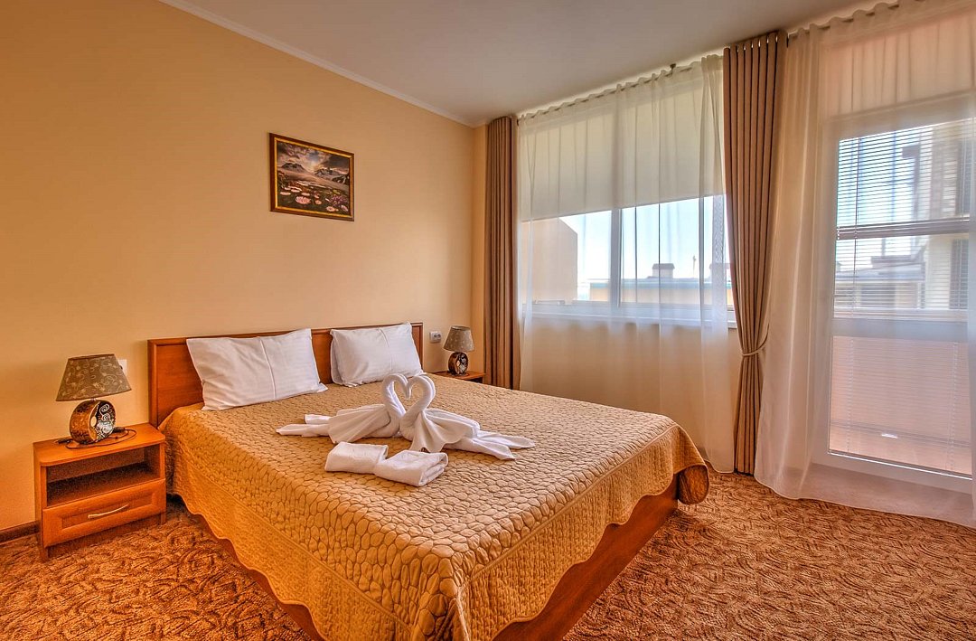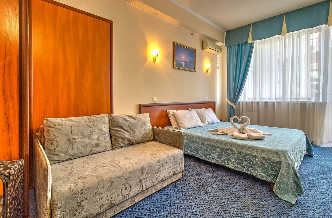 Уютный двухкомнатный номер общей площадью 34 кв.м с двумя балконами– это идеальный вариант для семейного отдыха. Номер данной категории состоит из двух смежных комнат – гостиной с мягким раскладным диваном и спальни с двуспальной кроватью, с каждой комнаты есть выход на собственный балкон с видом на море. Просторная ванная комната оснащена душевой кабиной и всеми необходимыми принадлежностями для комфортного отдыха. Парковки у Отеля нет!Услуги и удобства