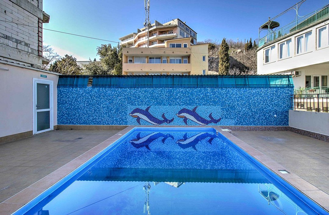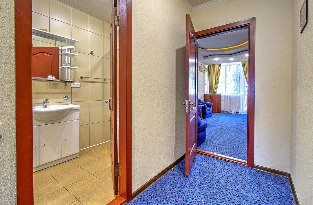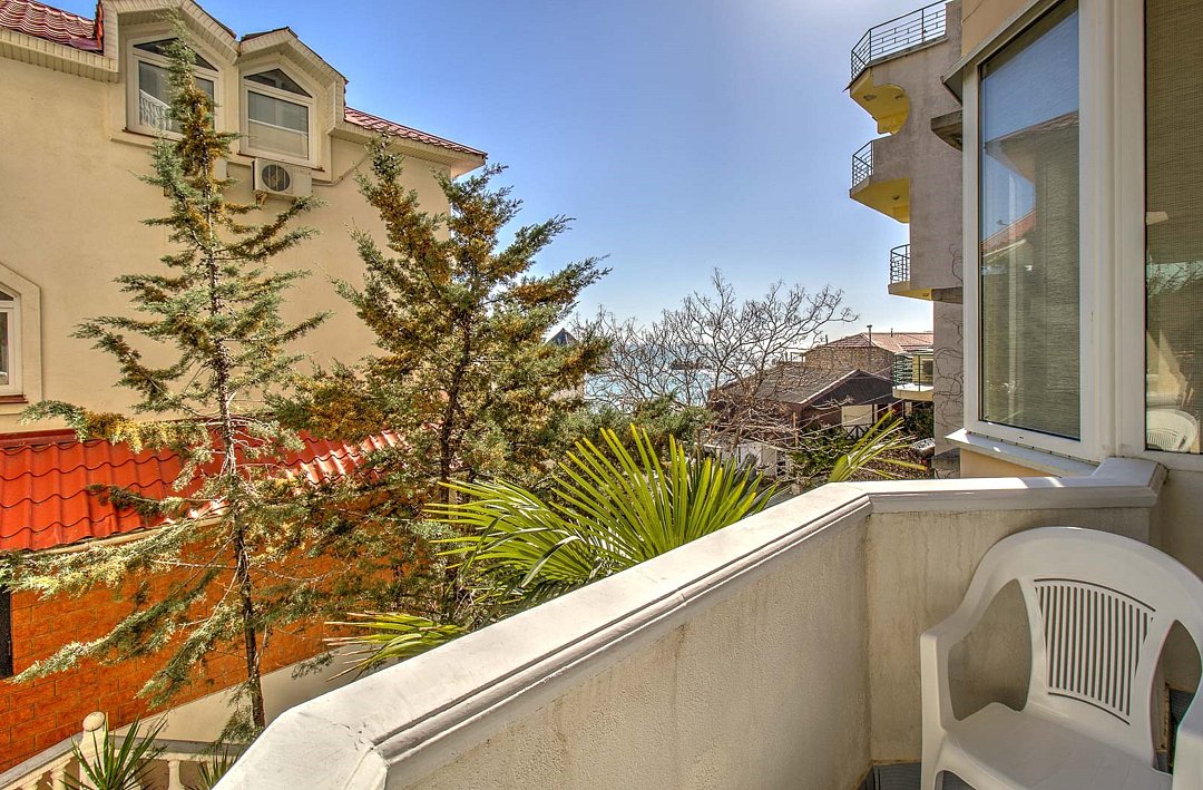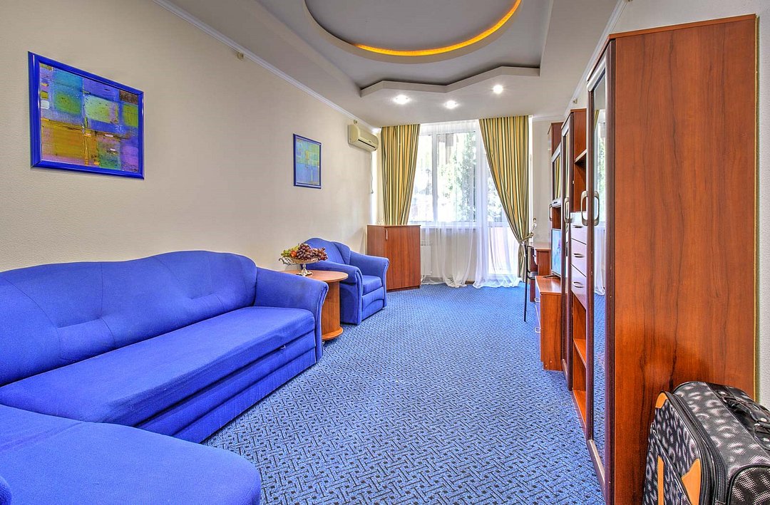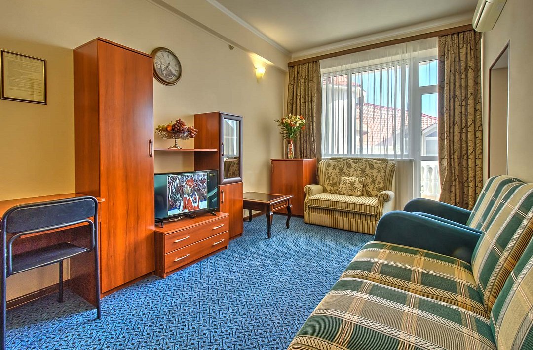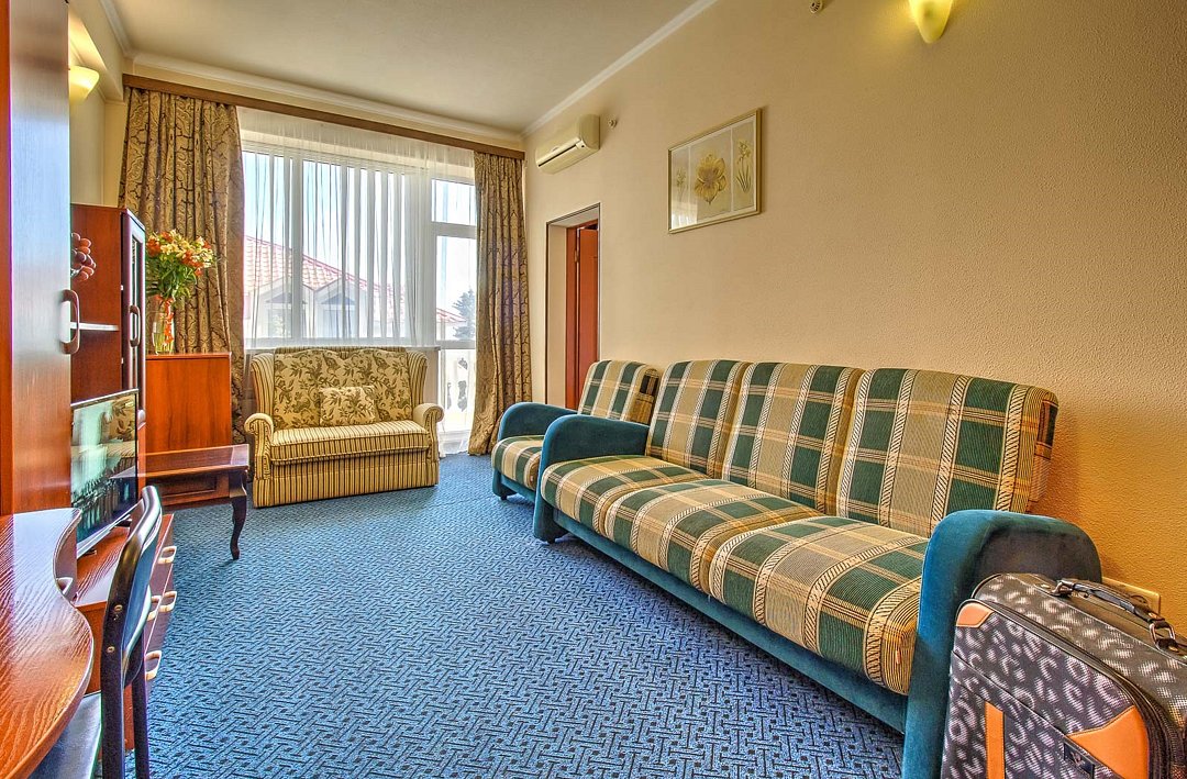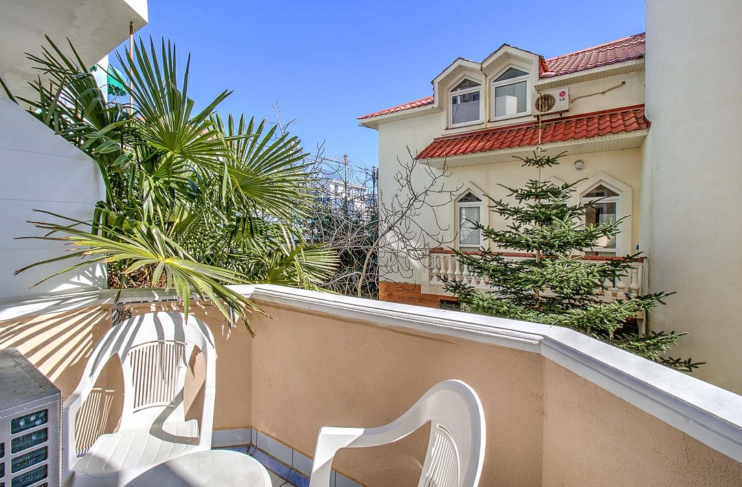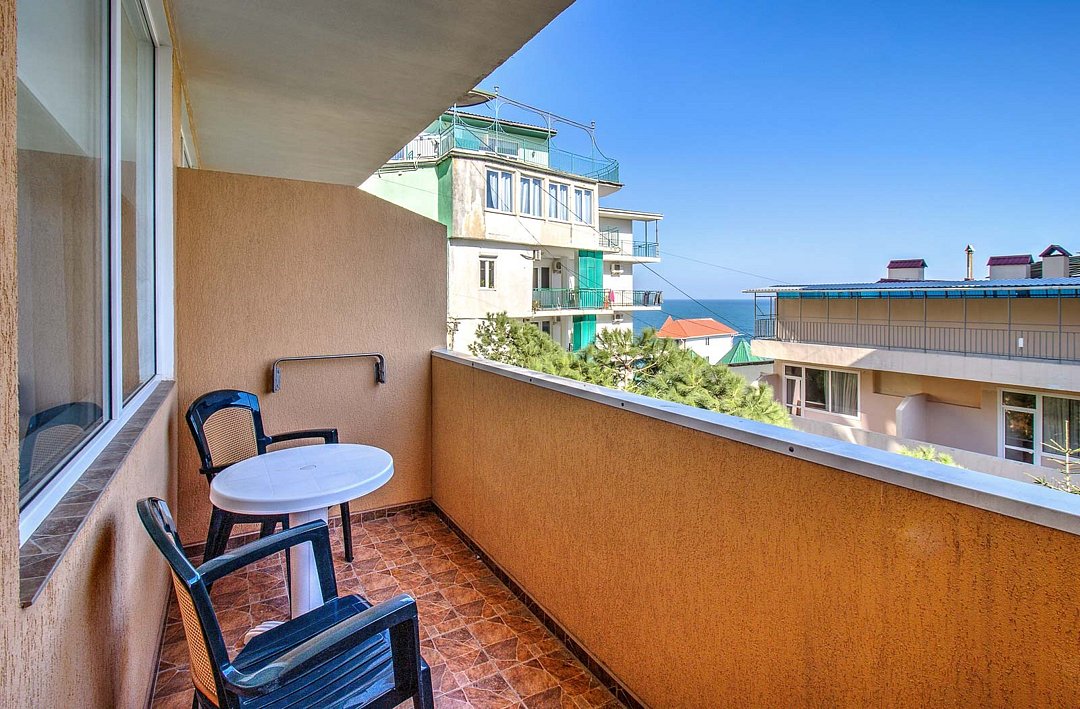 Просторный двухкомнатный номер общей площадью 50 кв.м с двумя балконами - это номер повышенной комфортности, где в распоряжение гостей предоставляется расширенный перечень мебели и бытовых приборов, который сделает отдых максимально полноценным и комфортным. Номера данной категории имеют две отдельные комнаты, разделенные прихожей, с каждой комнаты есть выход на собственный балкон. С одного балкона открывается чудесный панорамный вид на Черное море, которое утром светится при игривых лучах солнца, а вечером утопает в ярких красках заката. Со второго балкона вид на зеленый дворик отеля, где витает запах фитонцидов выделяемые хвойными растениями нашего сада. Просторная ванная комната оснащена угловой ванной и всеми необходимыми принадлежностями для отличного отдыха. Парковки у Отеля нет!Услуги и удобства