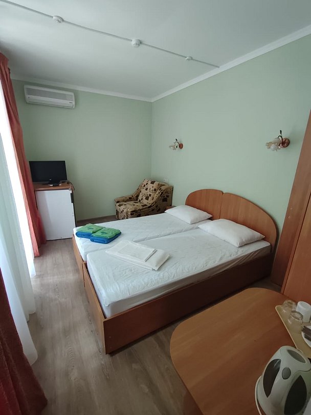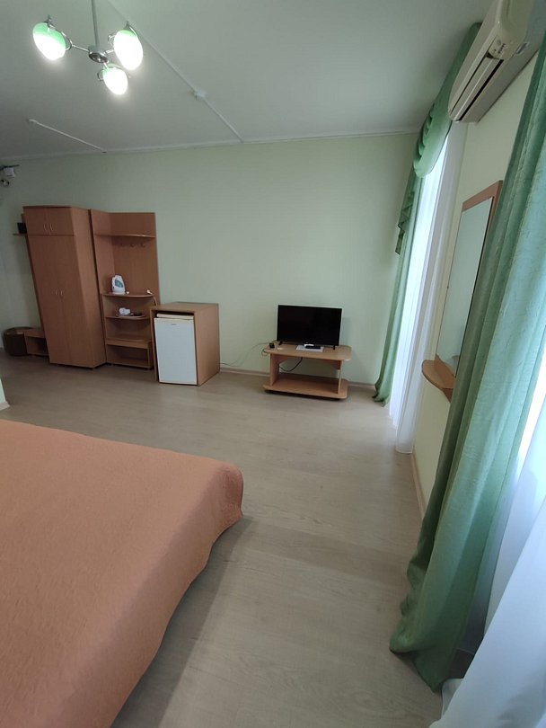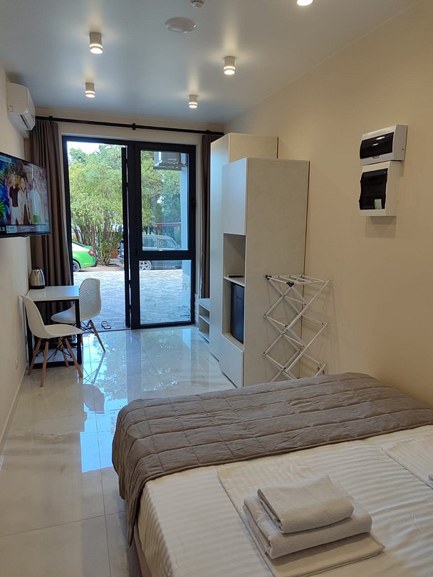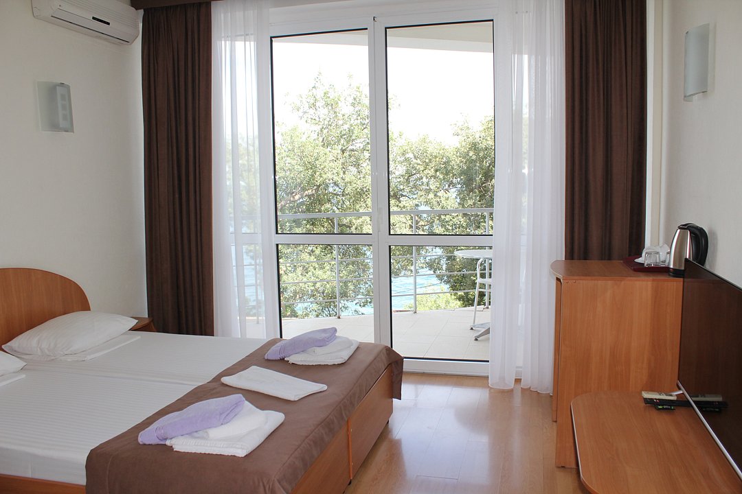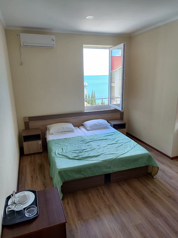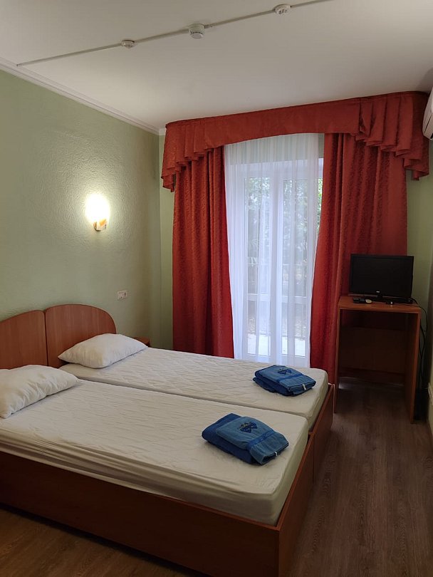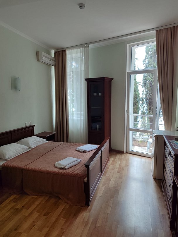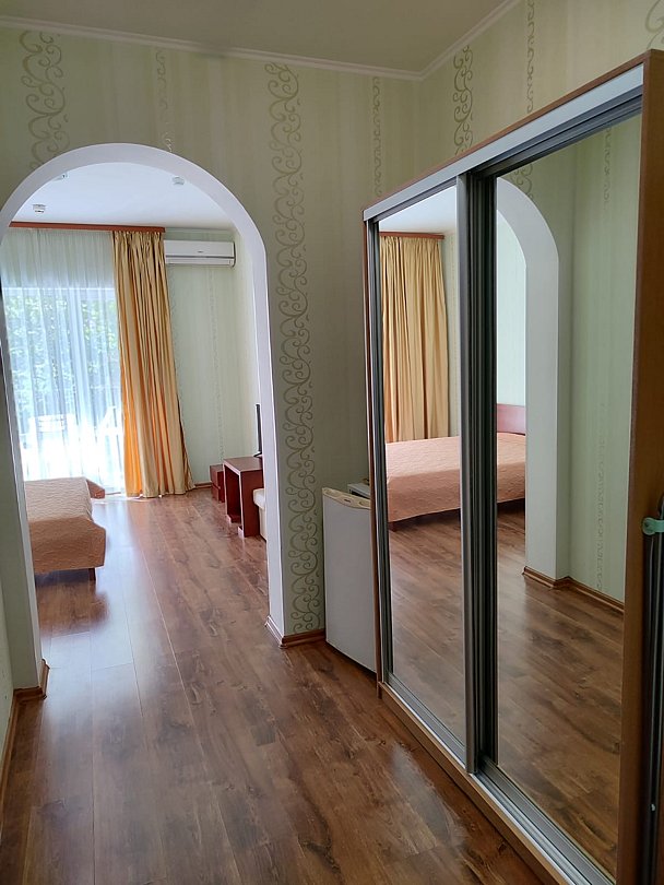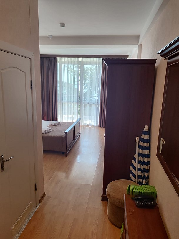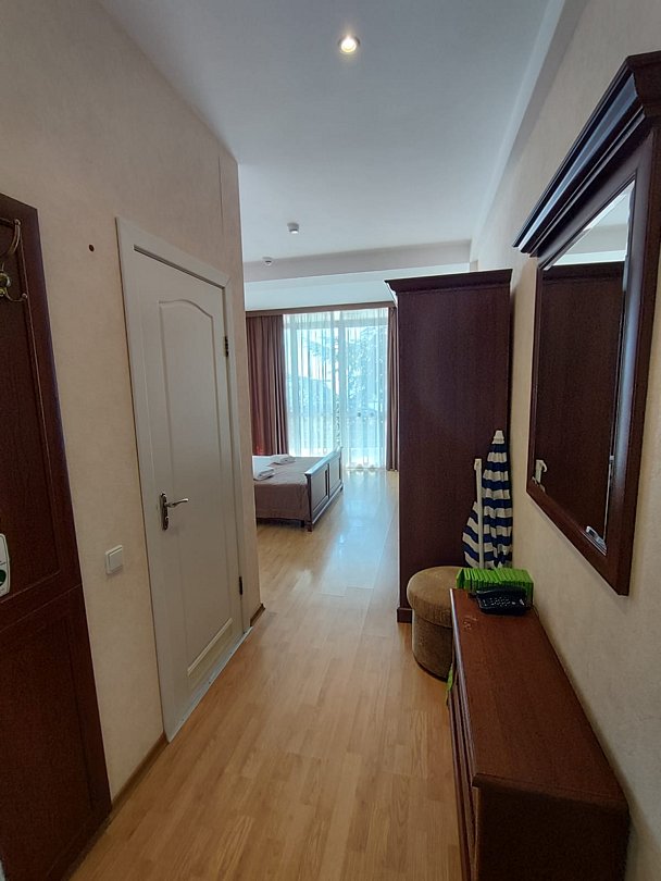 Номер расположен на первом этаже, имеет отдельный вход, до основного корпуса с кафе и бассейном 30 метров, до моря три минуты.