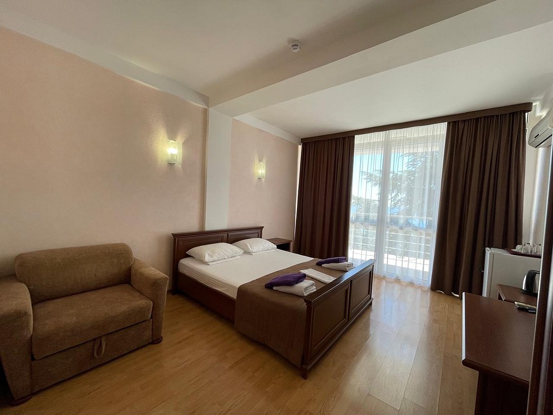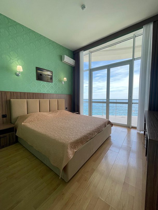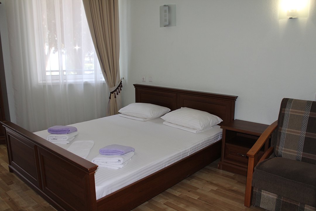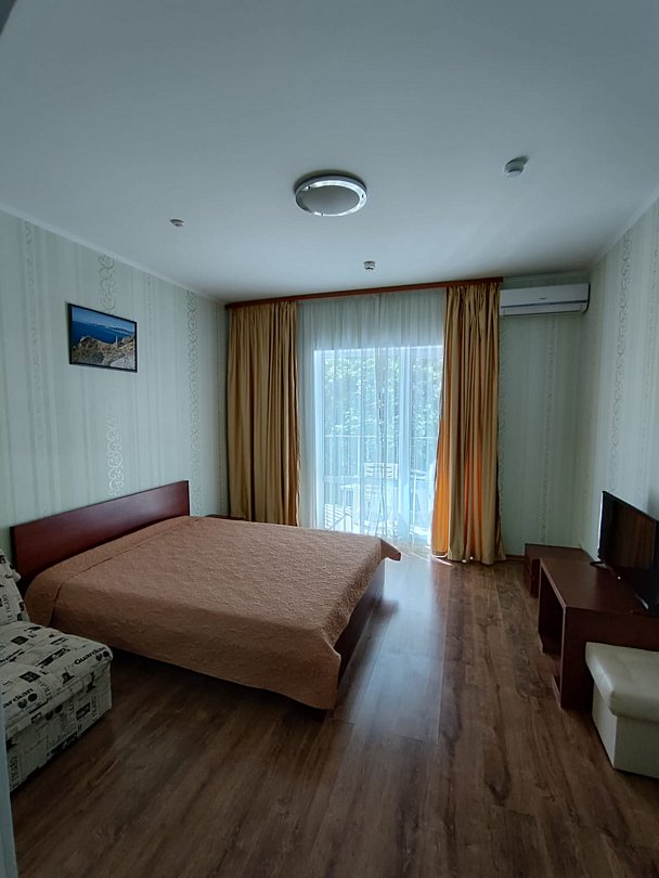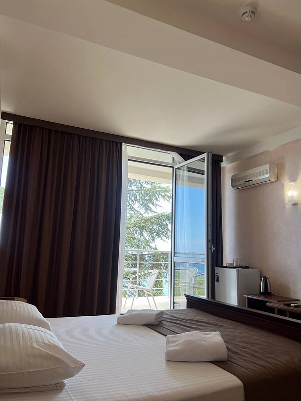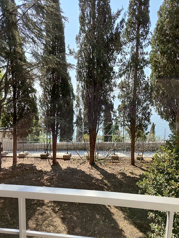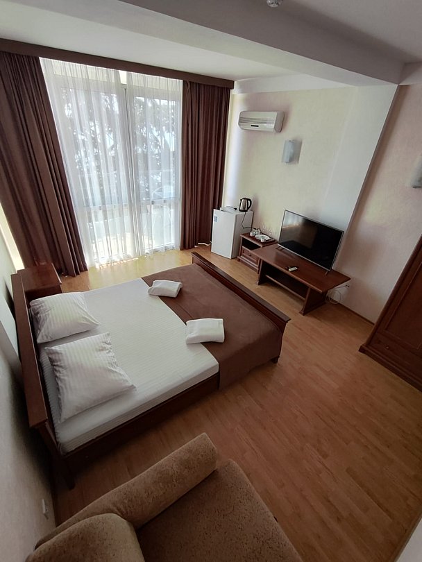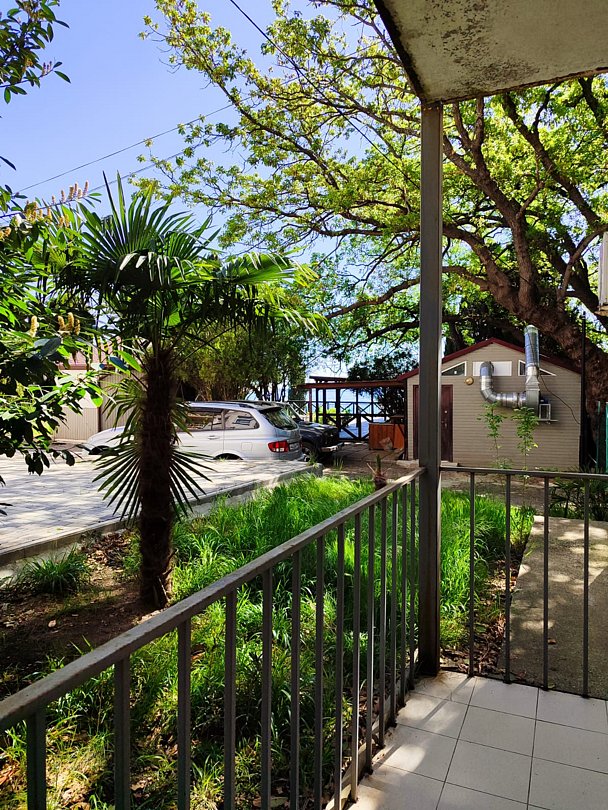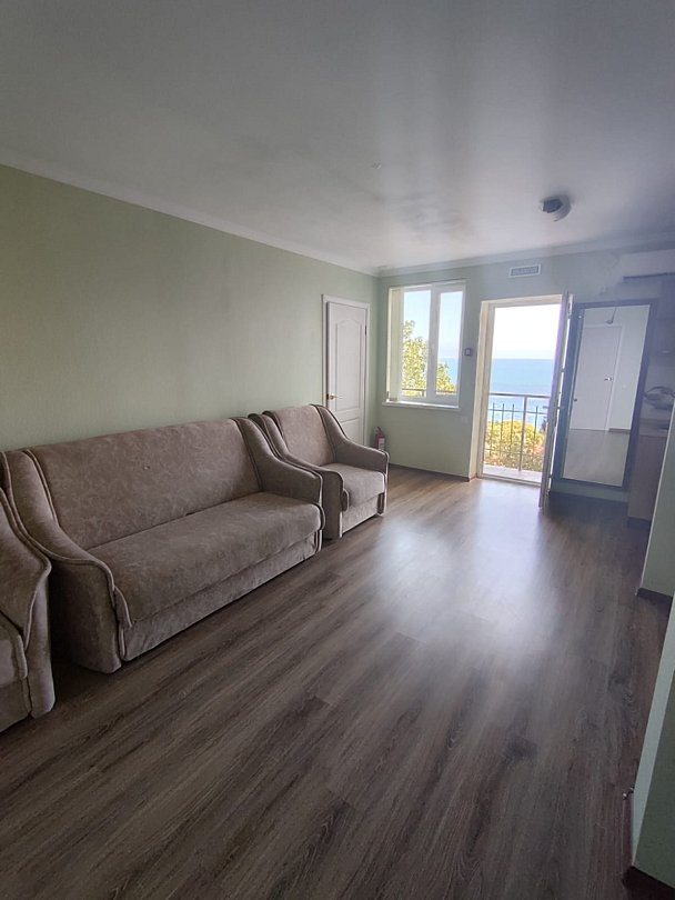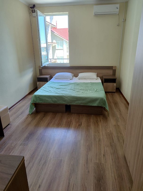 Номер расположен на первом этаже, имеет отдельный вход, до основного корпуса с кафе и бассейном 30 метров, до моря три минуты.