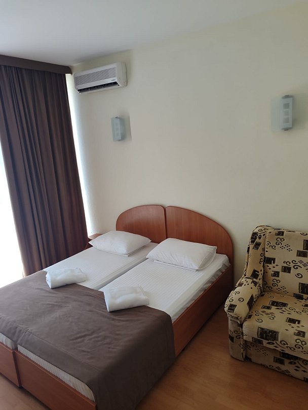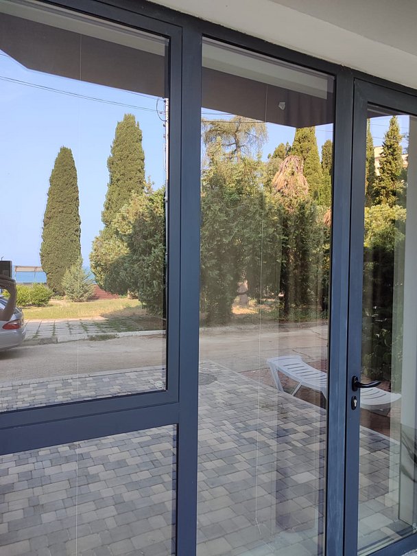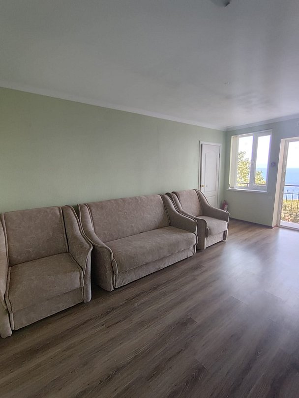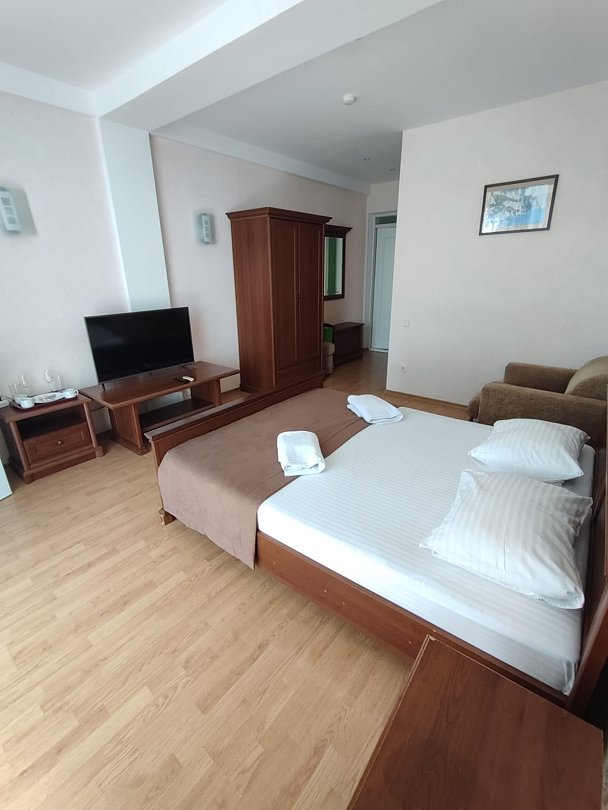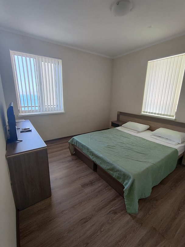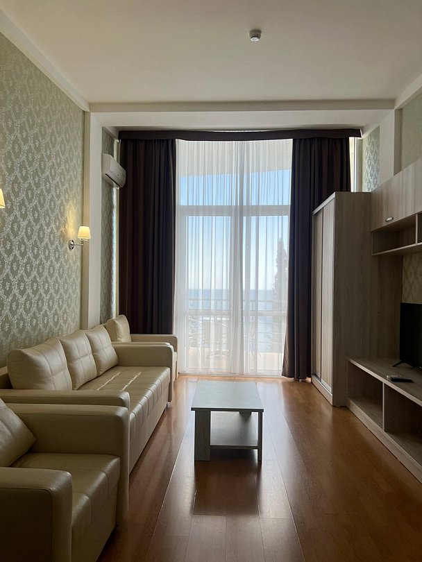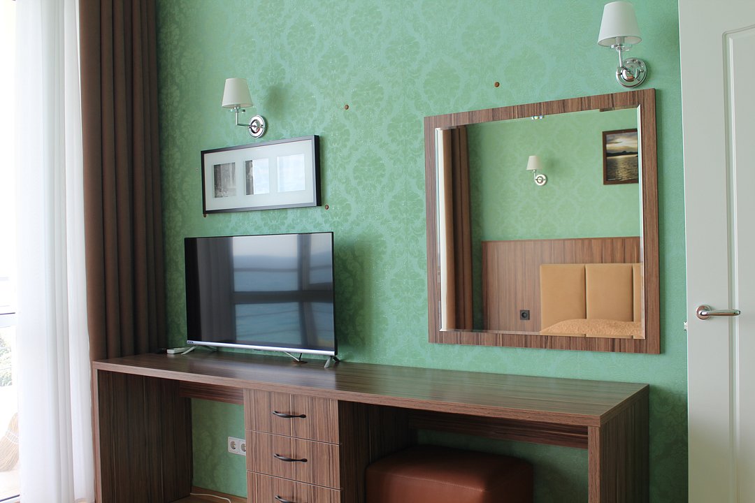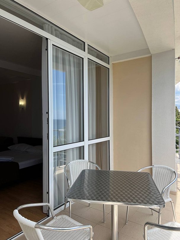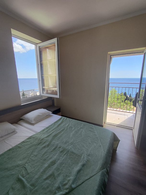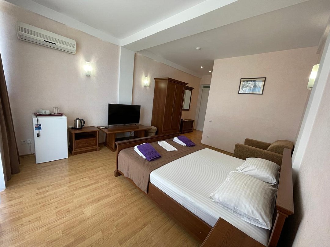 Номер расположен на первом этаже, имеет отдельный вход, до основного корпуса с кафе и бассейном 30 метров, до моря три минуты.
