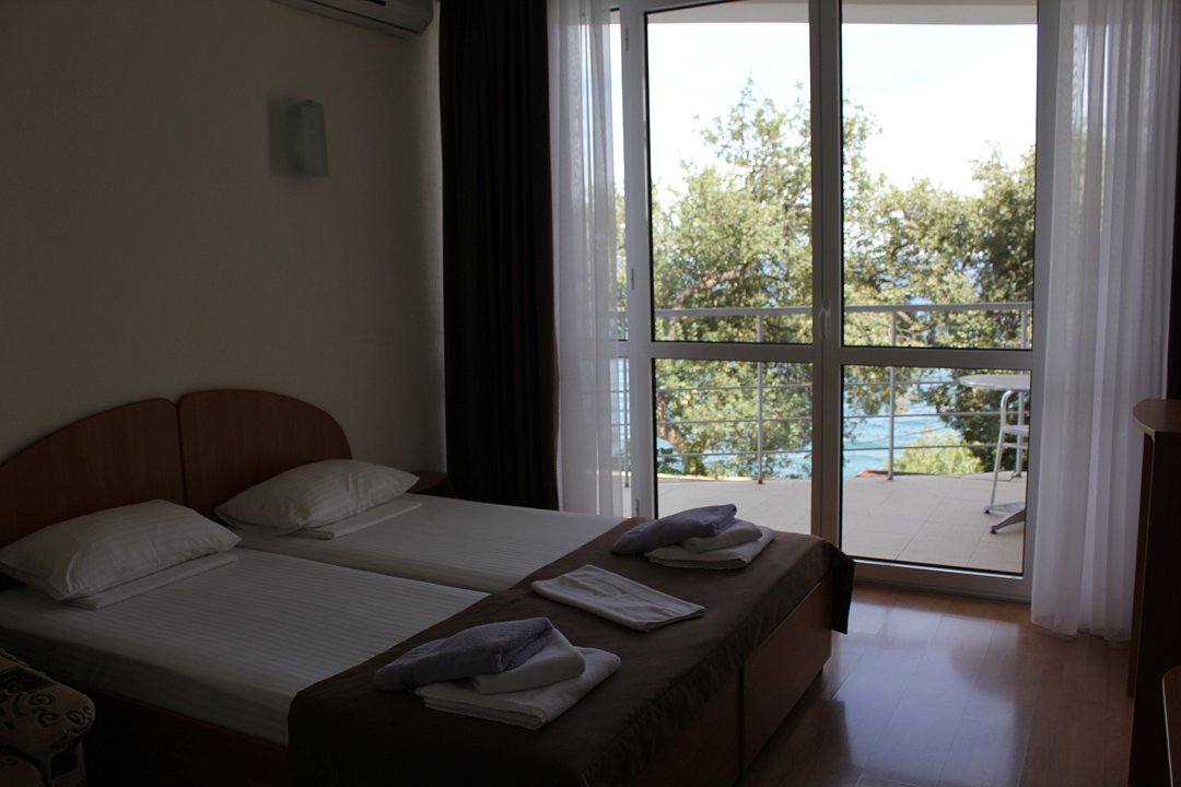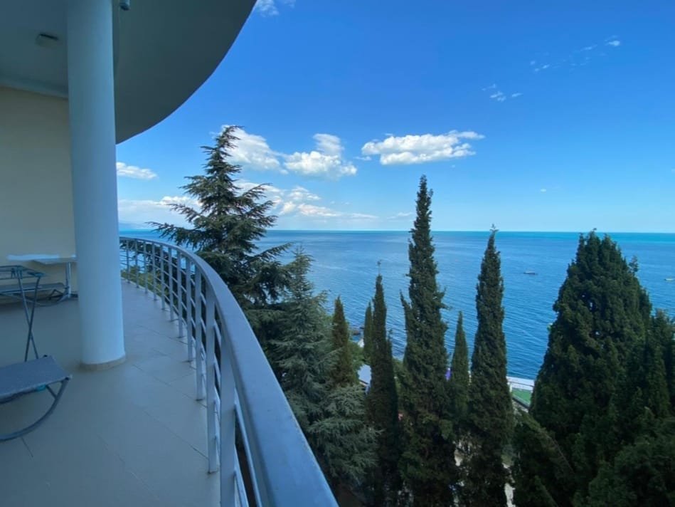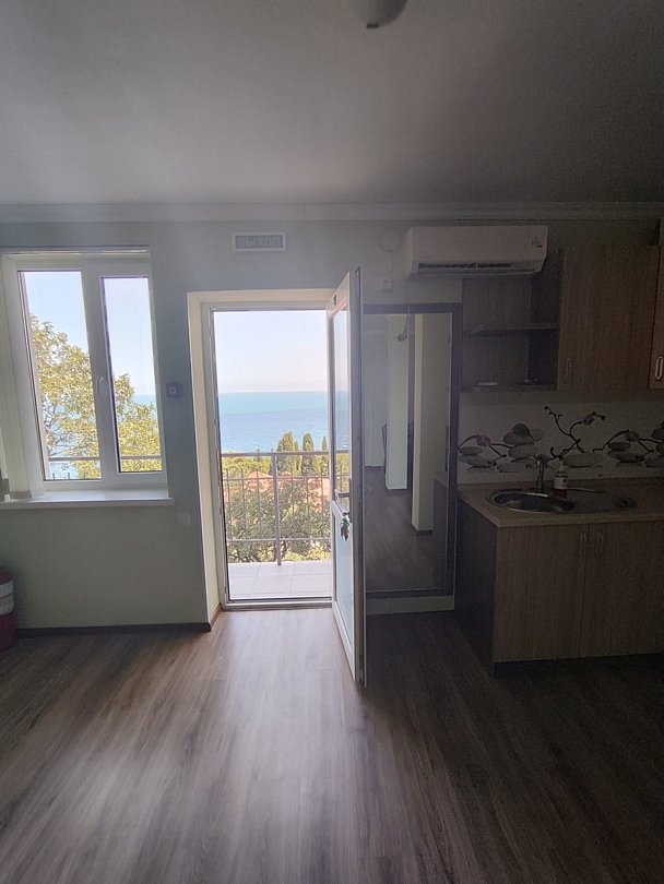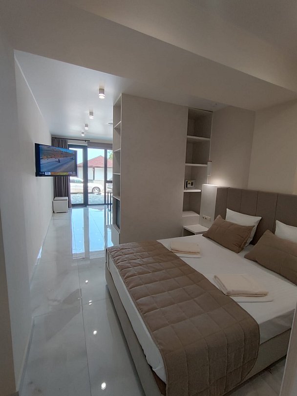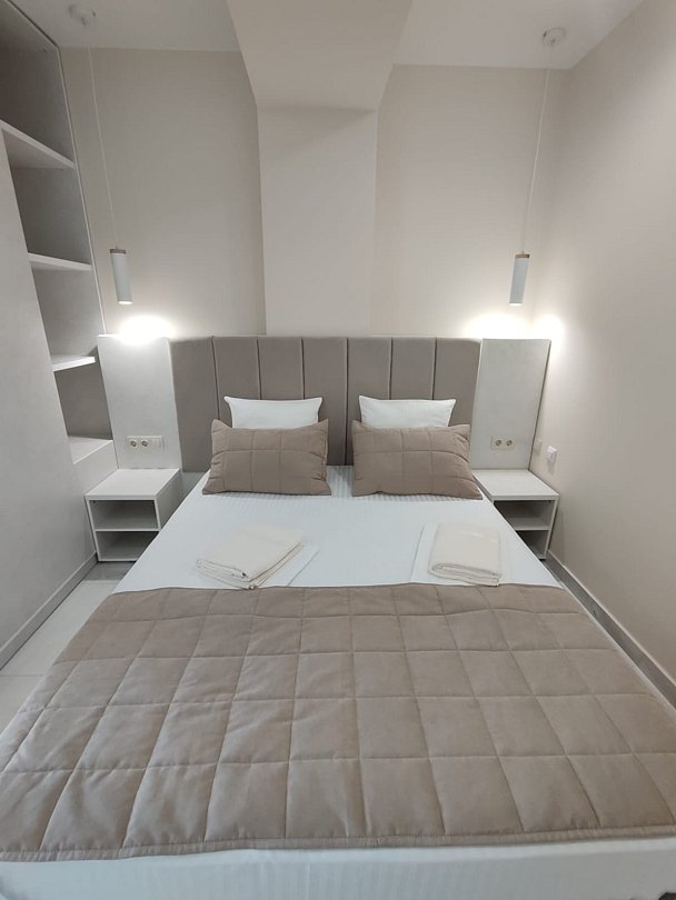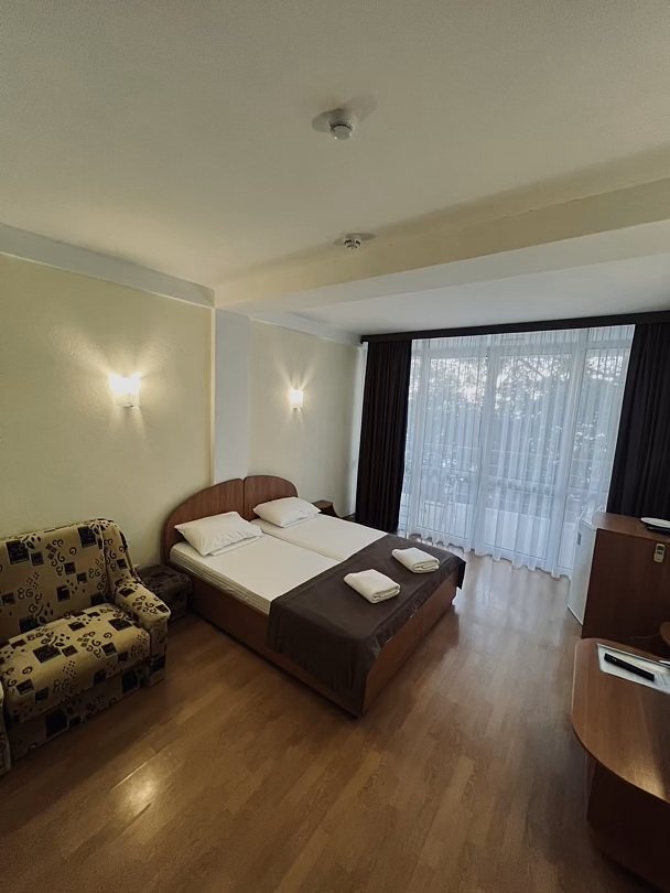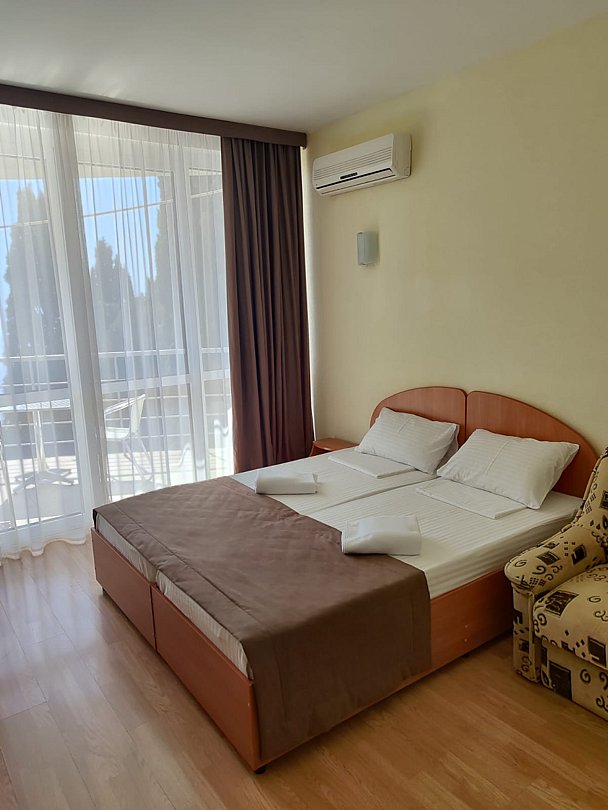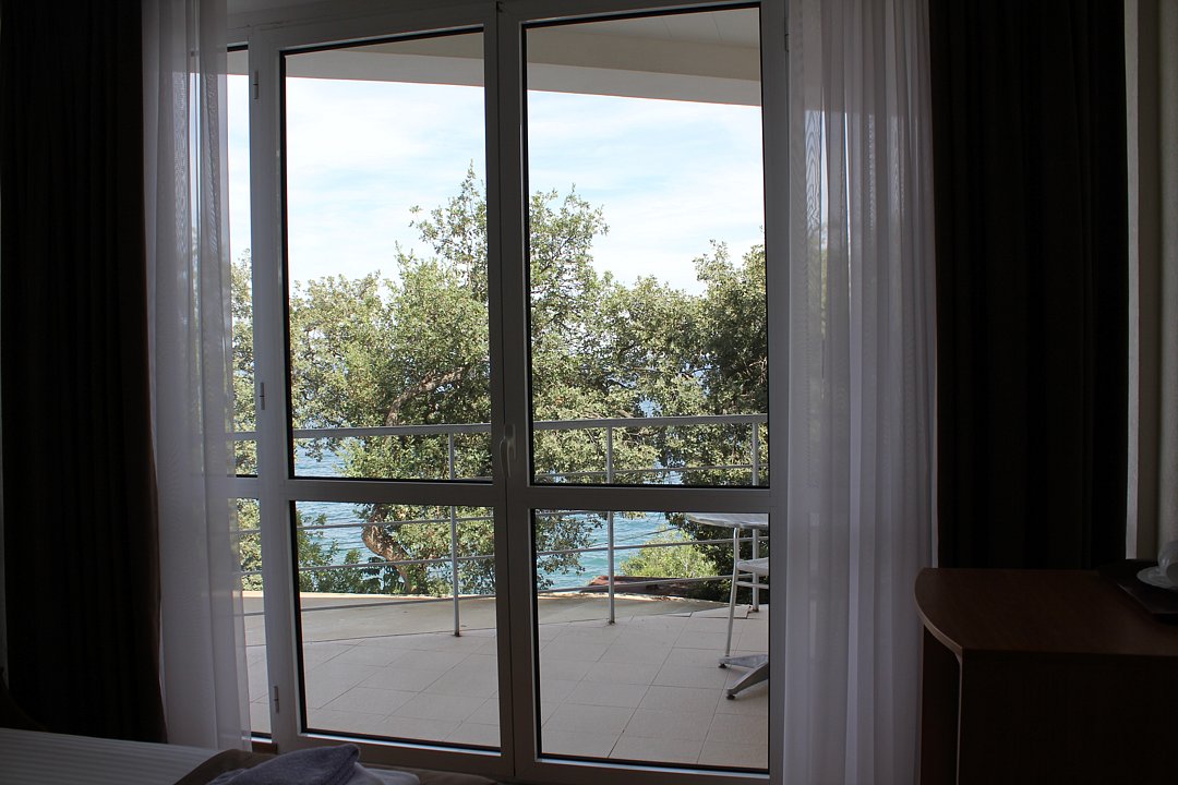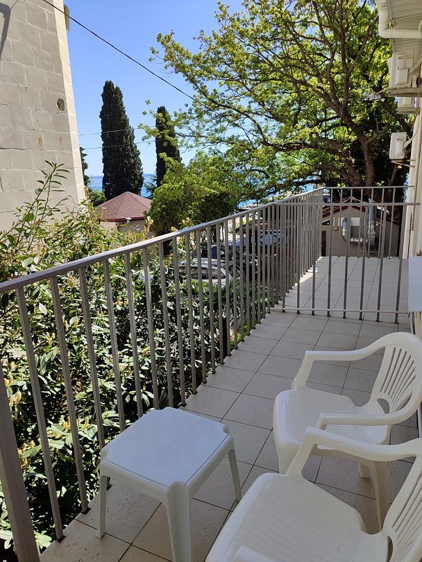 Номер расположен на первом этаже, имеет отдельный вход, до основного корпуса с кафе и бассейном 30 метров, до моря три минуты.