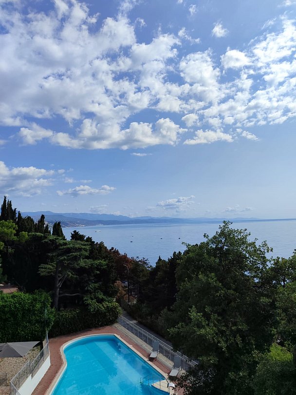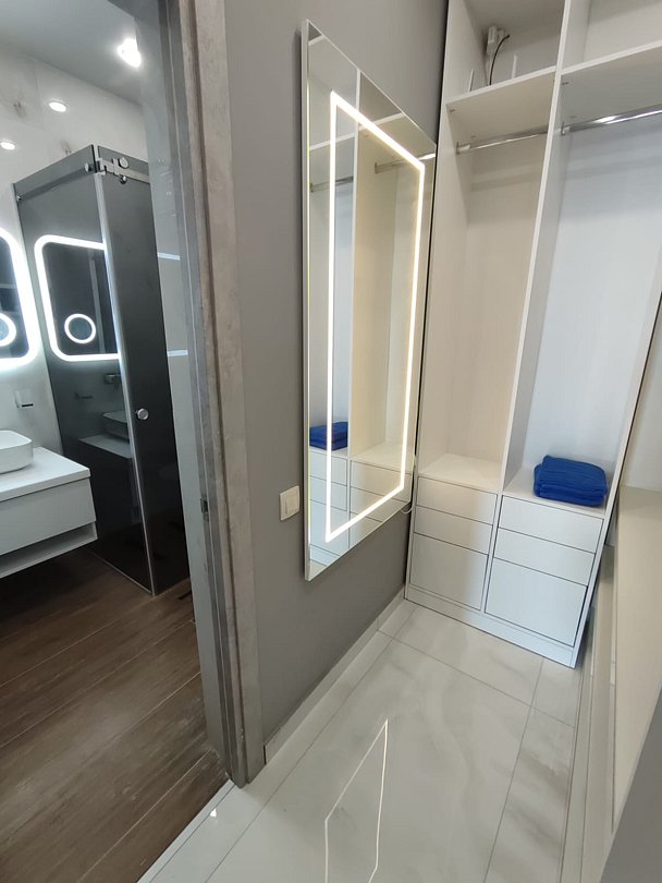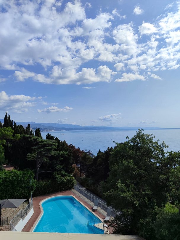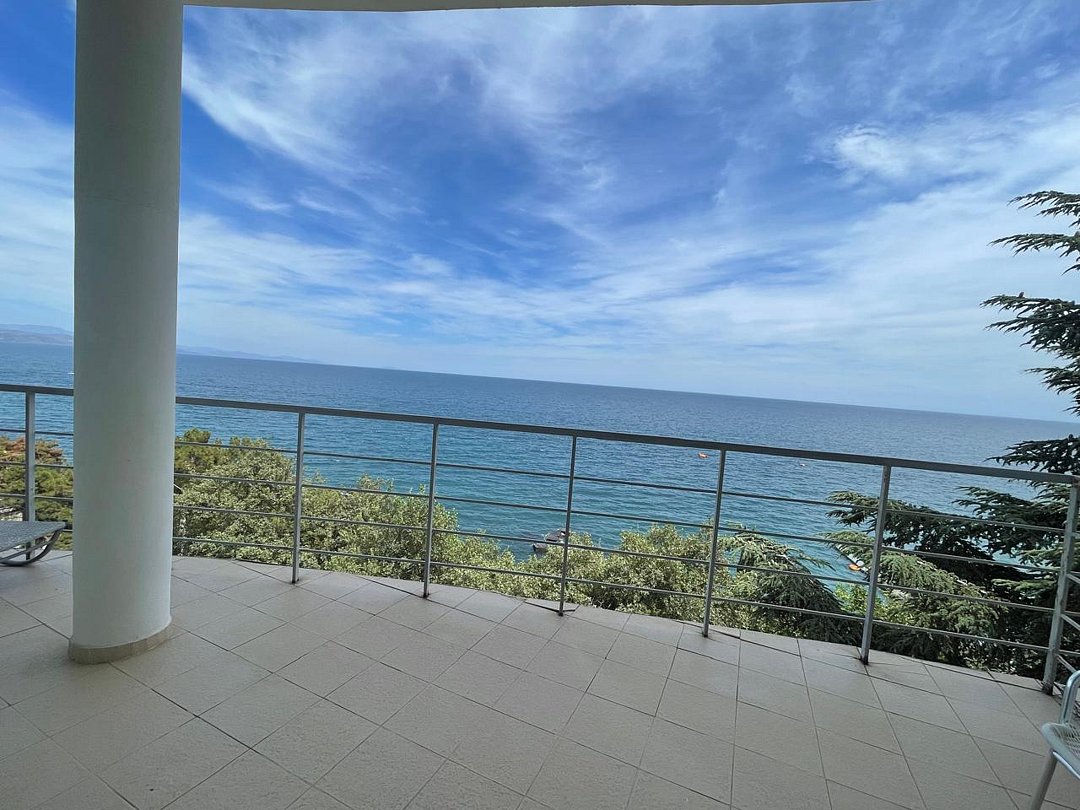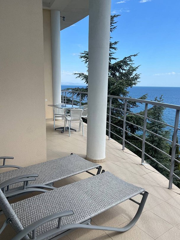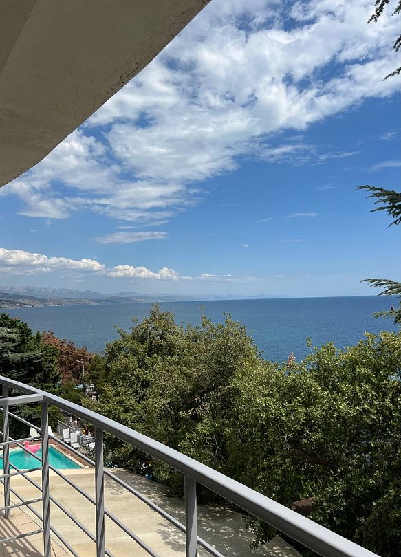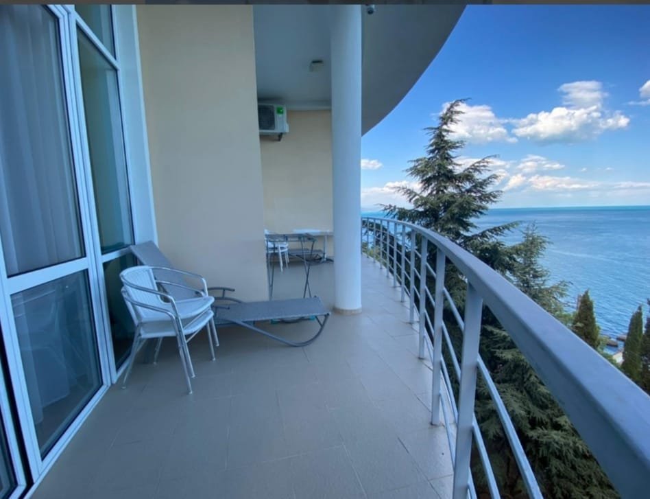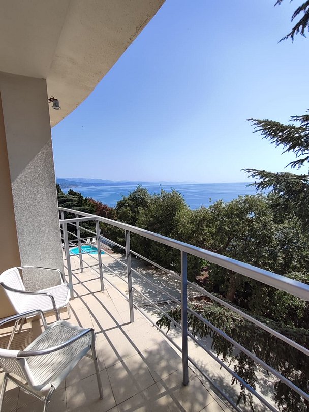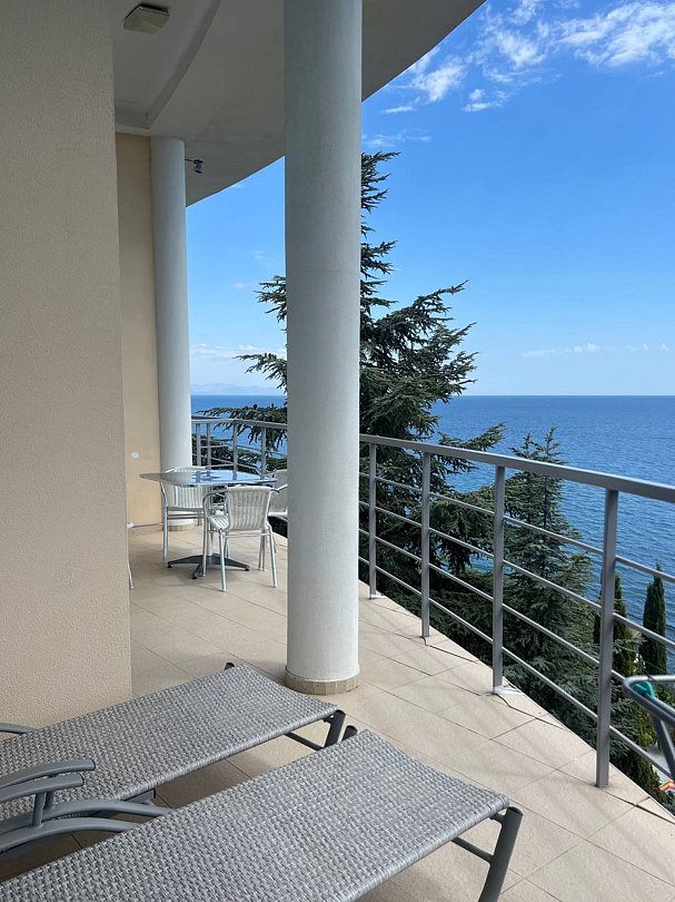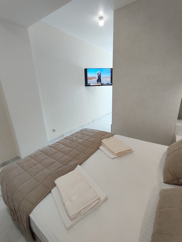 Номер расположен на первом этаже, имеет отдельный вход, до основного корпуса с кафе и бассейном 30 метров, до моря три минуты.