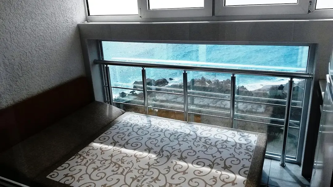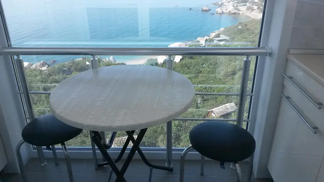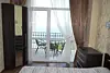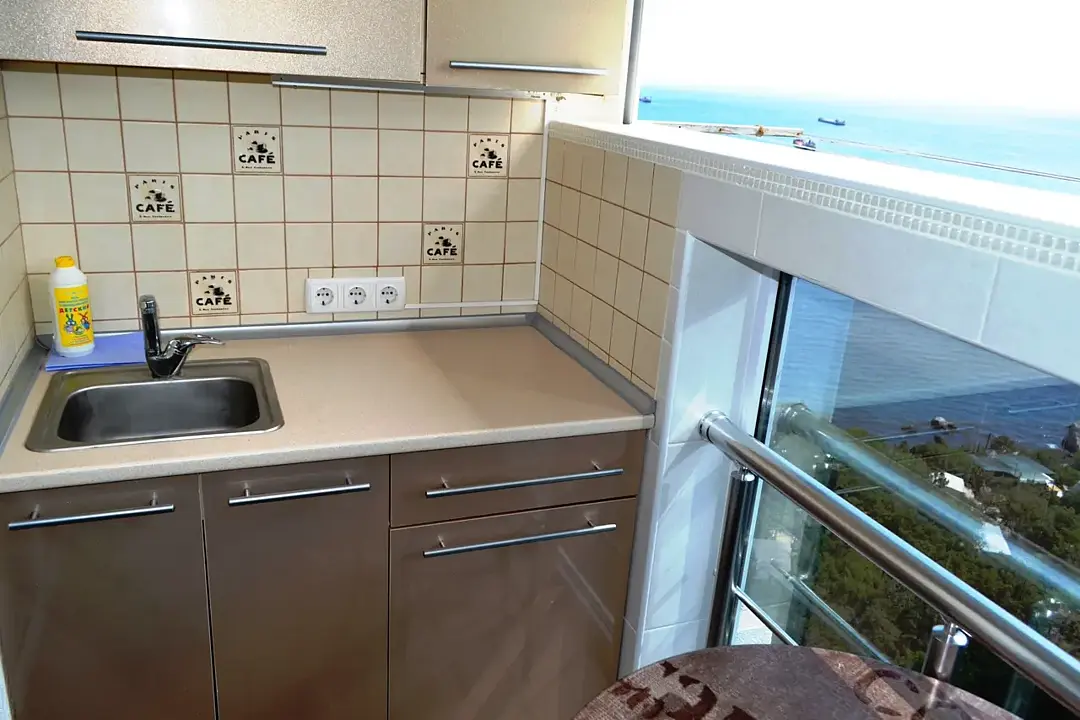 Номер на 6 этаже. С балкона открывается великолепный вид на море и горы. На балконе имеется оборудованная кухня, а также электрический роллет, защищающий от солнца и дождя.