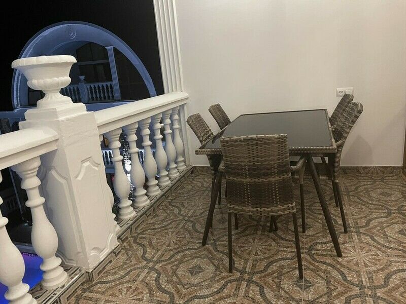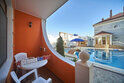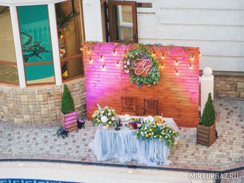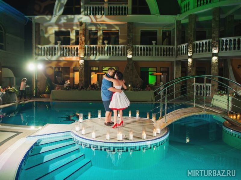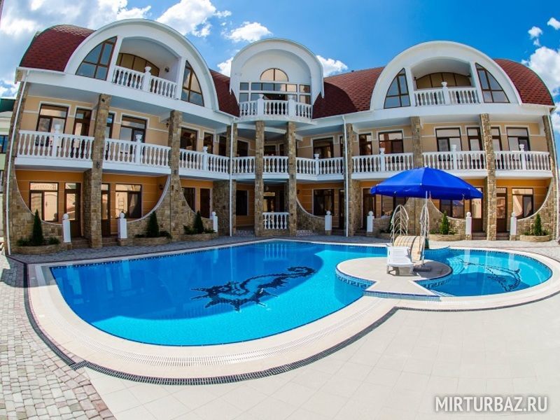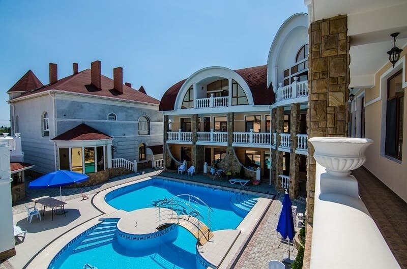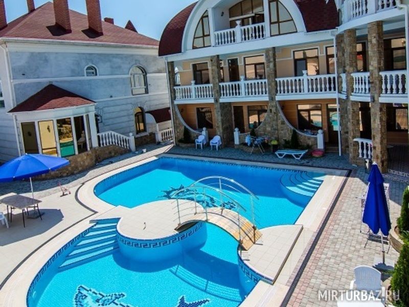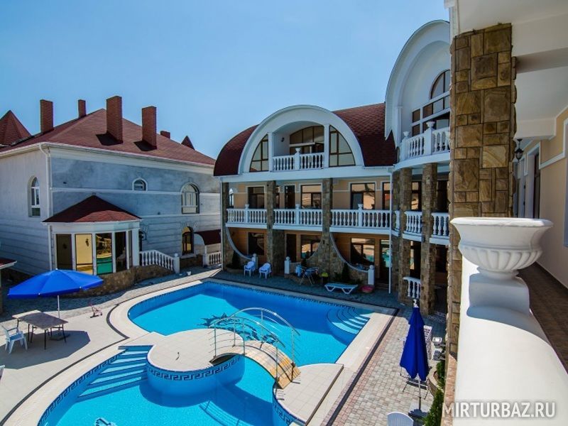 - Продуманная инфраструктура. Это полностью продуманное чрезвычайно красивое пространство. Это внутренний двор в обрамлении нарядных балконов, на которые есть выходы из комнат гостевого дома. Место, где можно загорать, плавать, плескаться в двух бассейнах причудливой формы, представляющих собой очень гармоничную и необычную композицию. Фон для потрясающих свадебных фотосессий.