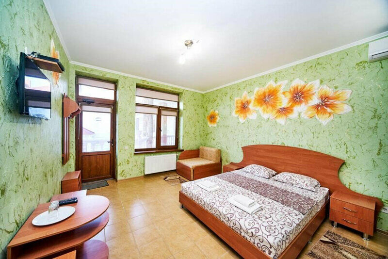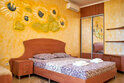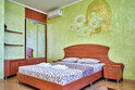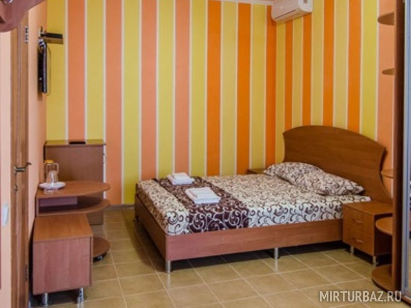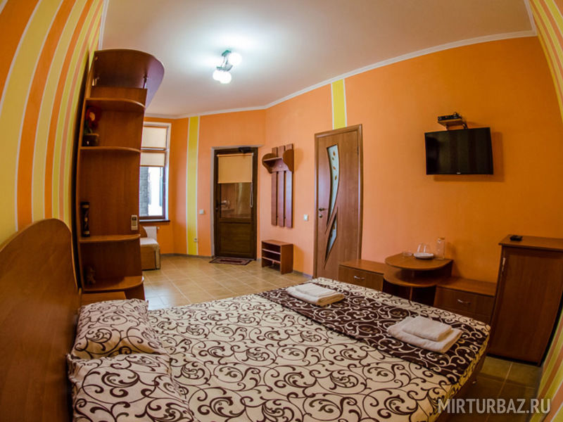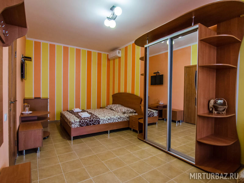 Двуспальная кровать queen-size, раскл. диванчик 90-200 см, шкаф-купе, столик на колесах, 5 тумбочек, 3 прикроватных коврика, 2 коврика в санузле, посуда (тарелки и стаканы), вешалка, подставка для обуви, часы, спутниковое ТВ (25 каналов), отдельный санузел: душ, туалет-инсталляция, умывальник, зеркало, полочка стеклянная.