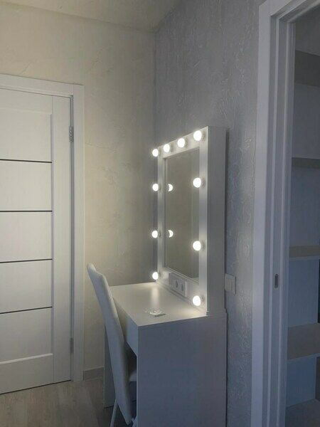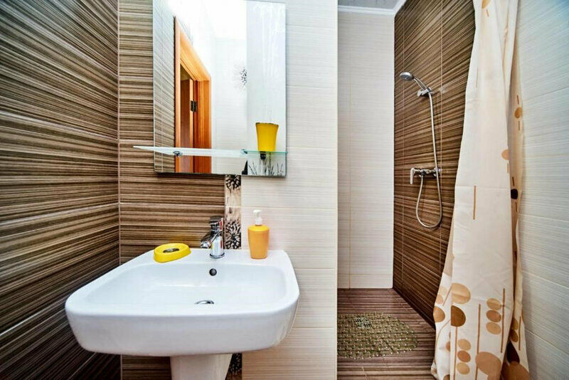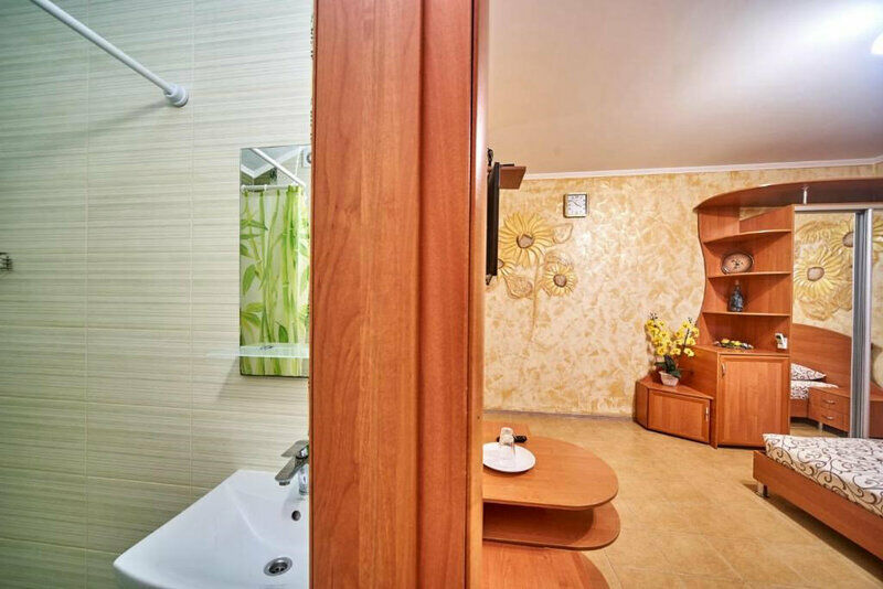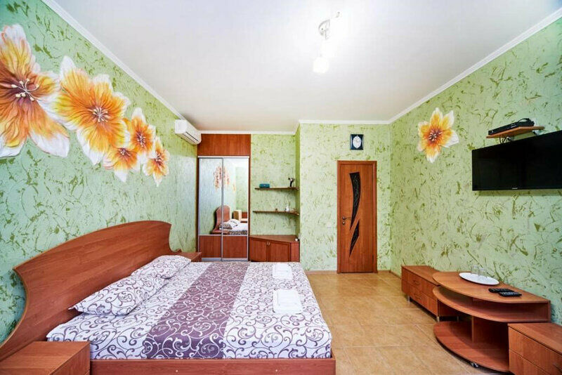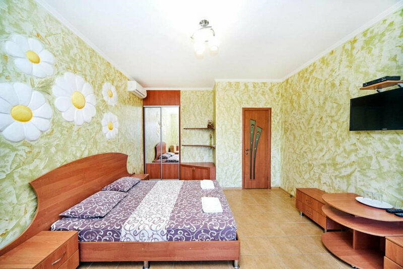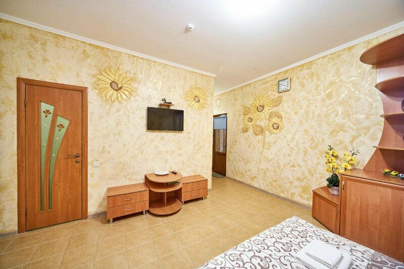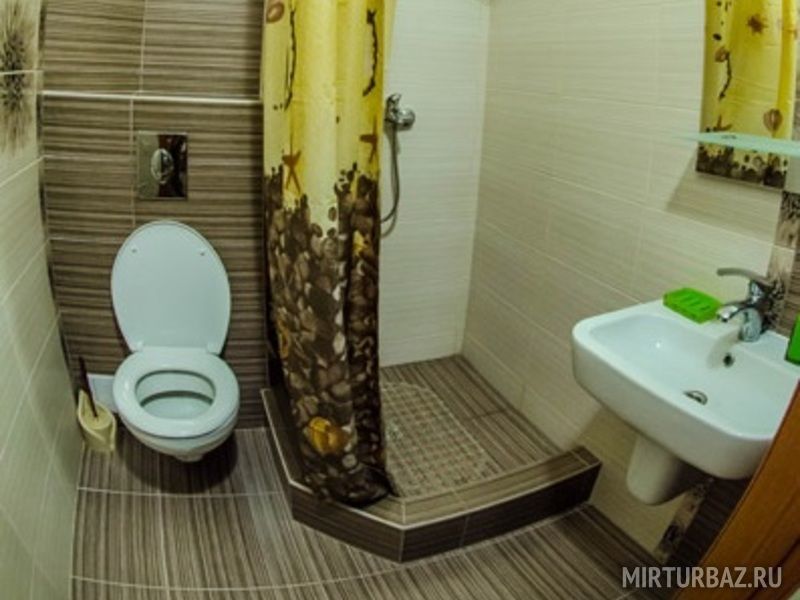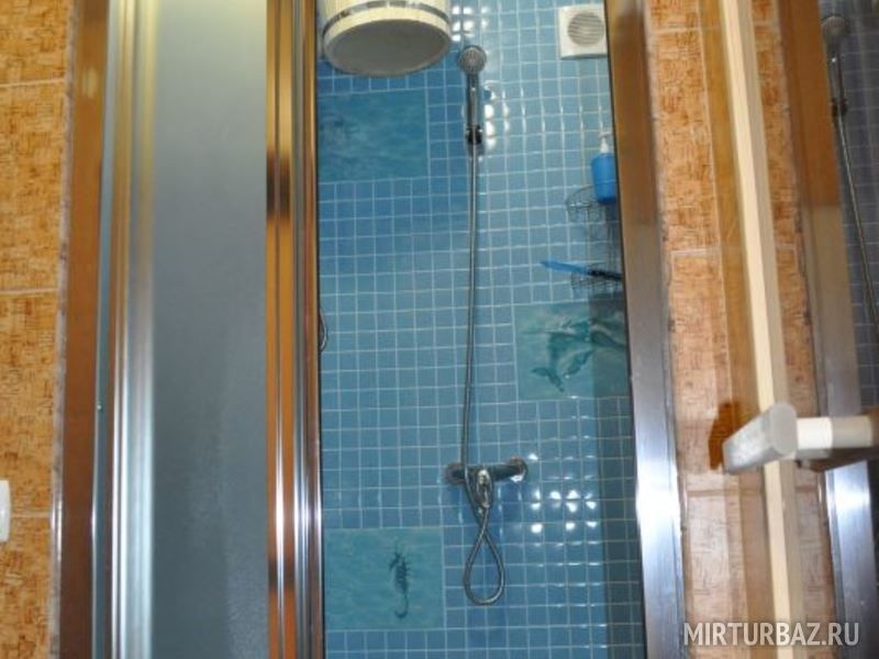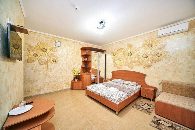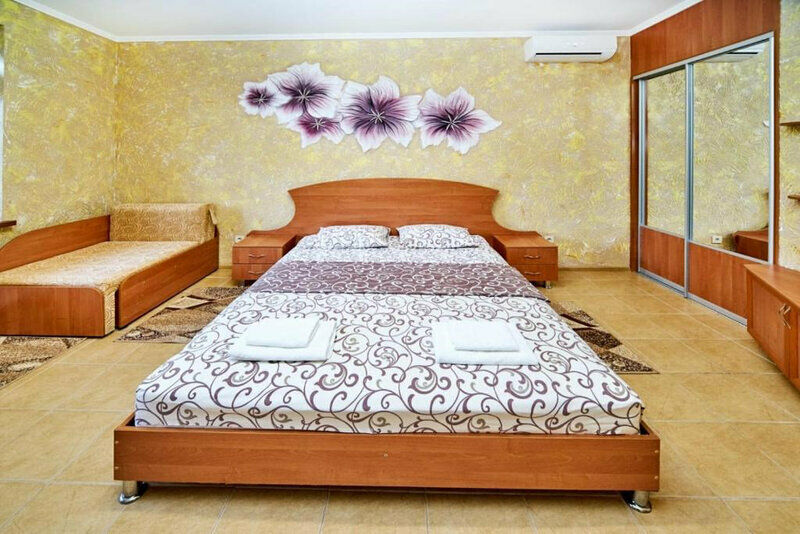 Двуспальная кровать 160-200 см, раскл. диванчик 90-200 см, шкаф-купе, столик на колесах, 5 тумбочек, 3 прикроватных коврика, 2 коврика в санузле, посуда (тарелки и стаканы), вешалка, подставка для обуви, часы, спутниковое ТВ (25 каналов), отдельный санузел: душ, туалет-инсталляция, умывальник, зеркало, полочка стеклянная.