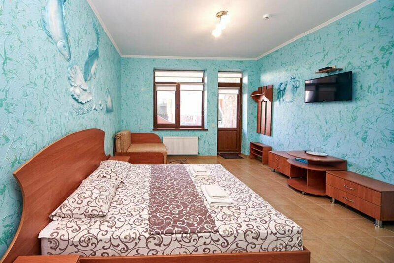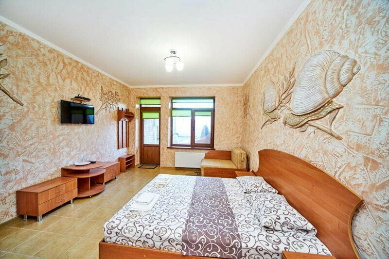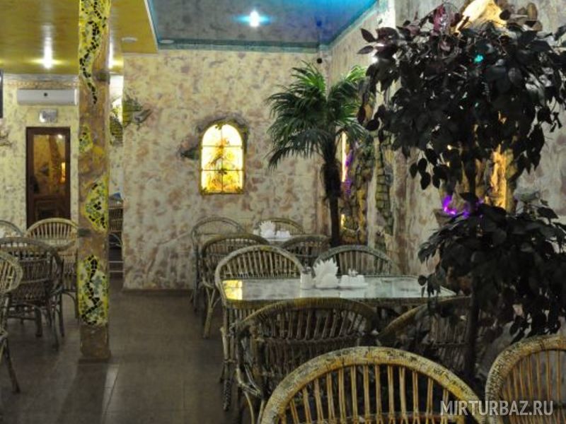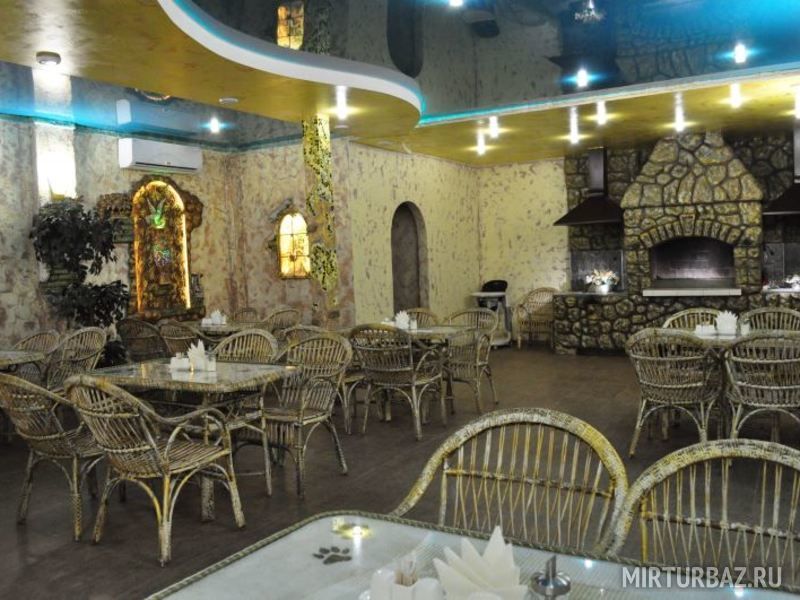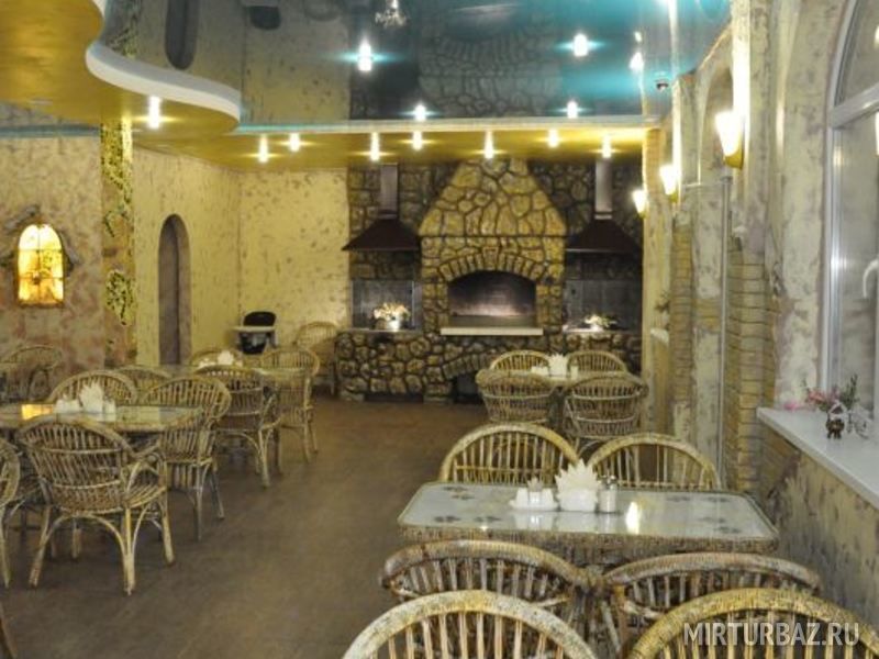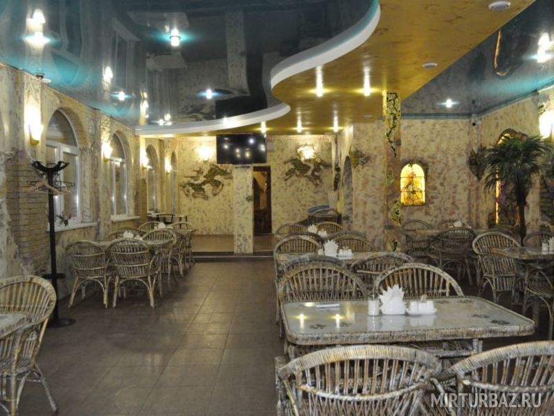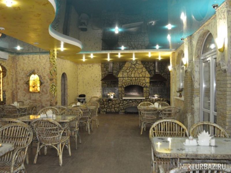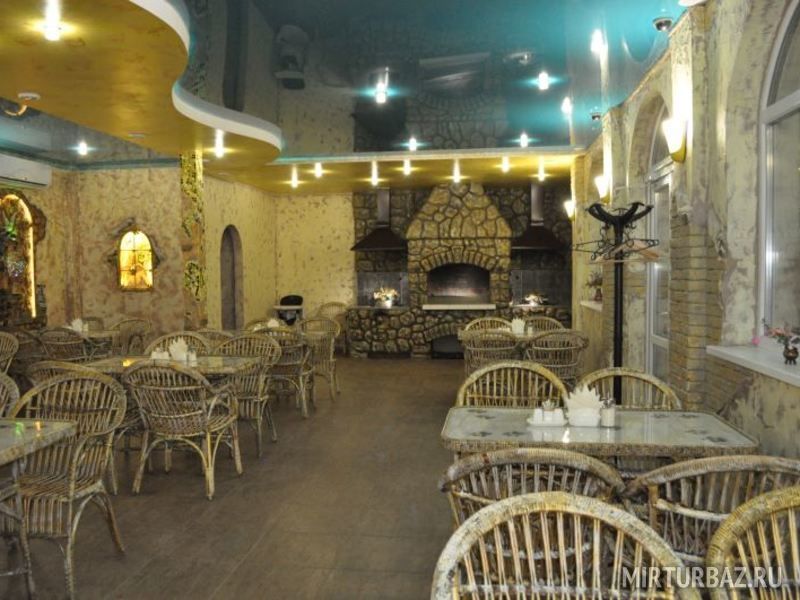 Здесь приятно не только питаться, но и просто сидеть и отдыхать, наслаждаясь атмосферой покоя и уюта! Удобная плетенная мебель сочетается с чудесными растениями в кадках и оригинальной настенной лепниной необычных панно. Общее впечатление дополняет потолок, своими очертаниями и цветовым решением напоминающий лучшее, что есть в этих краях — море, песок и незабываемые пляжи! Можно с абсолютной уверенностью сказать, что этот гостевой дом Евпатории с питанием у моря создал в своих стенах по-настоящему уютное пространство для семейных трапез.