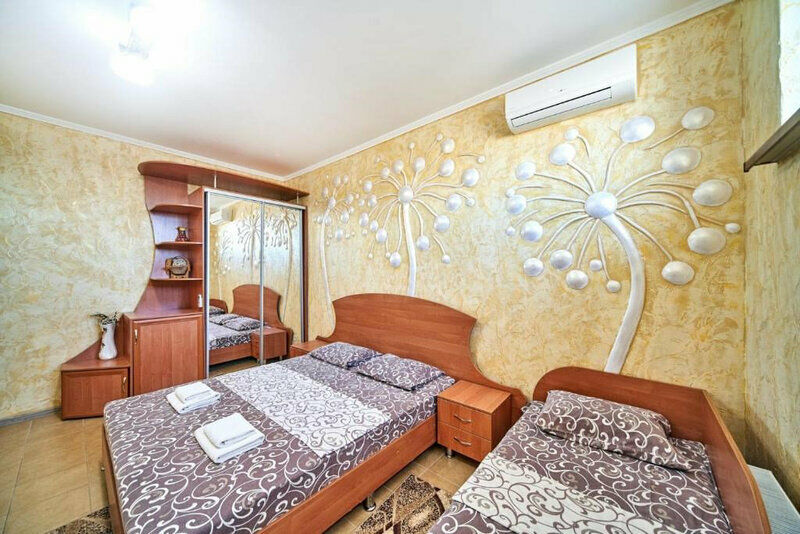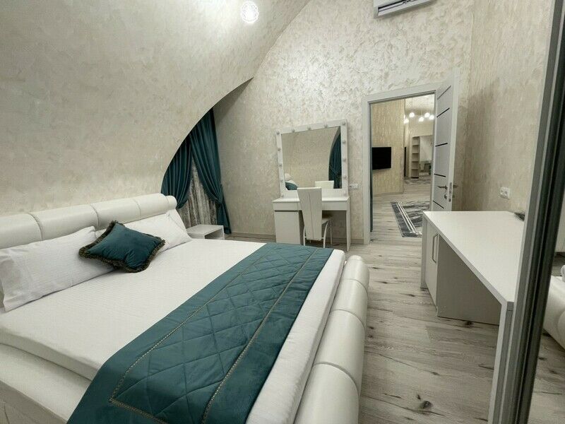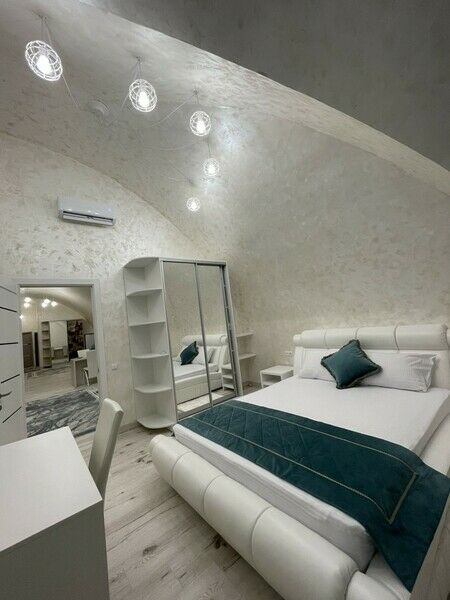 Комната располагается на 3-м этаже. Современный дизайн с круглым потолком (стены переходят в потолок). Две спальные комнаты и большой зал с большим и маленьким диванами (диваны раскладываются, спальное место 160х200 см и 90х200). В большой спальне – тоже раскладное кресло. Два кондиционера в каждой спальне, в зале - кассетный кондиционер.