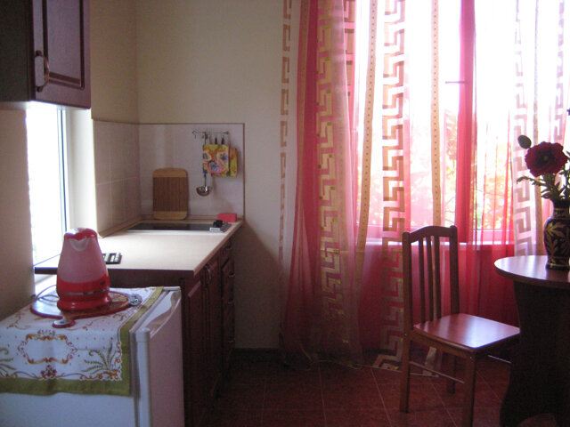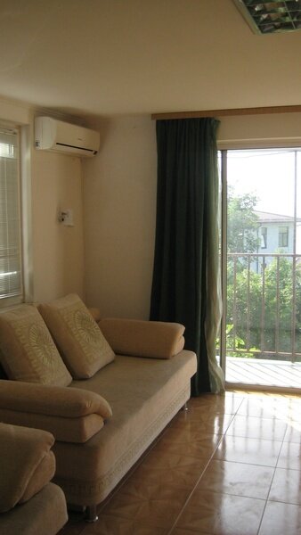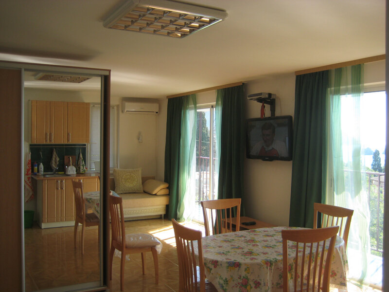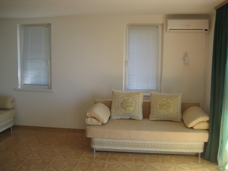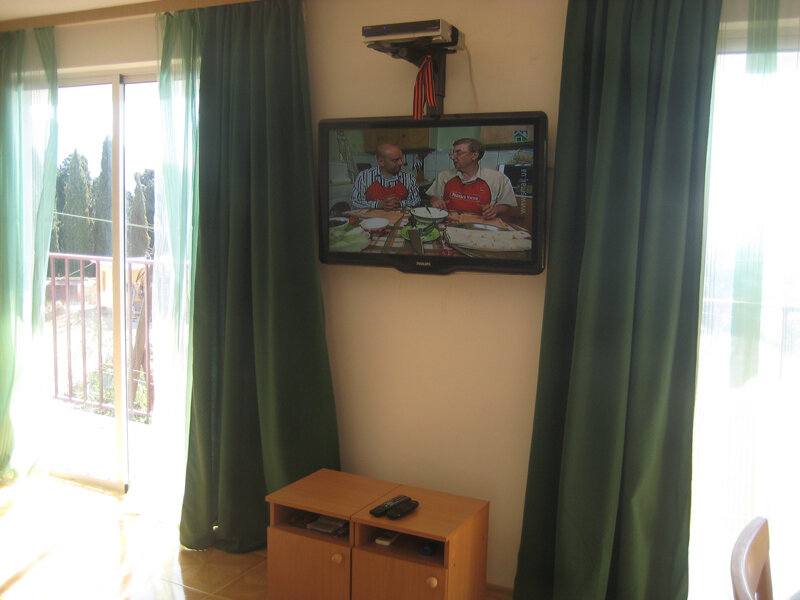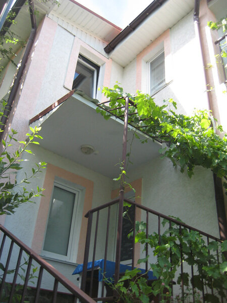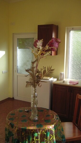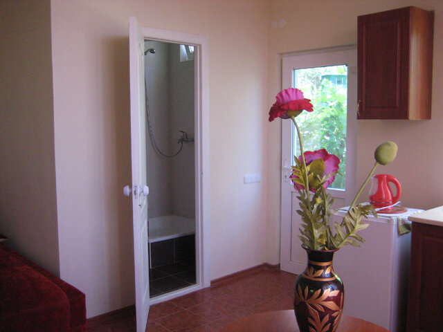 На втором этаже просторный номер «Зеленый» класса «люкс» для большой семьи или компании (40 кв. метров) с тремя двуспальными кроватями, с балконом и хорошим видом на море, просторная ванная комната, стиральная машина, кухня, шкаф, большие зеркала, плазменный телевизор. В каждом номере в наличии телевизор, кондиционер, кухня, душ с горячей водой, санузел. Все чисто, опрятно.