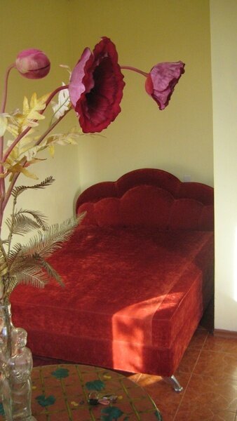 Номер «Красный», выполнен в Красных тонах, на 1 этаже, 20 кв. м с широкой двуспальной кроватью. Вид из окна в сад на инжировое дерево свозь которое проглядывает море. Подходит одиноким людям, молодоженам, семейным парам с маленьким ребенком. Есть возможность поставить дополнительное место. Все удобства.