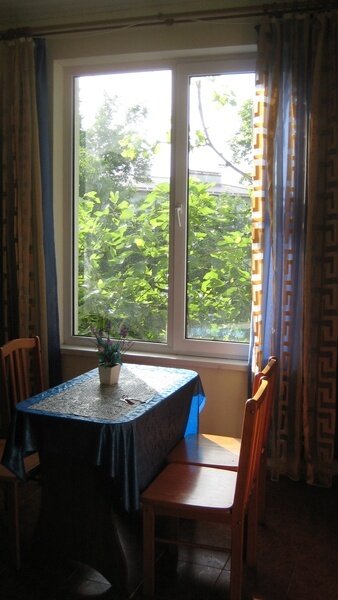 Номер «Синий», выполнен в синих тонах, на 1 этаже, 20 кв. м с двумя раскладывающимися диван-кроватями. Вид из окна в сад на инжировое дерево свозь которое проглядывает море. Подходит одиноким людям, молодоженам, семейным парам с подростком, семейным парам с двумя маленькими детьми. Все удобства.