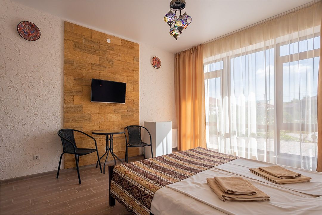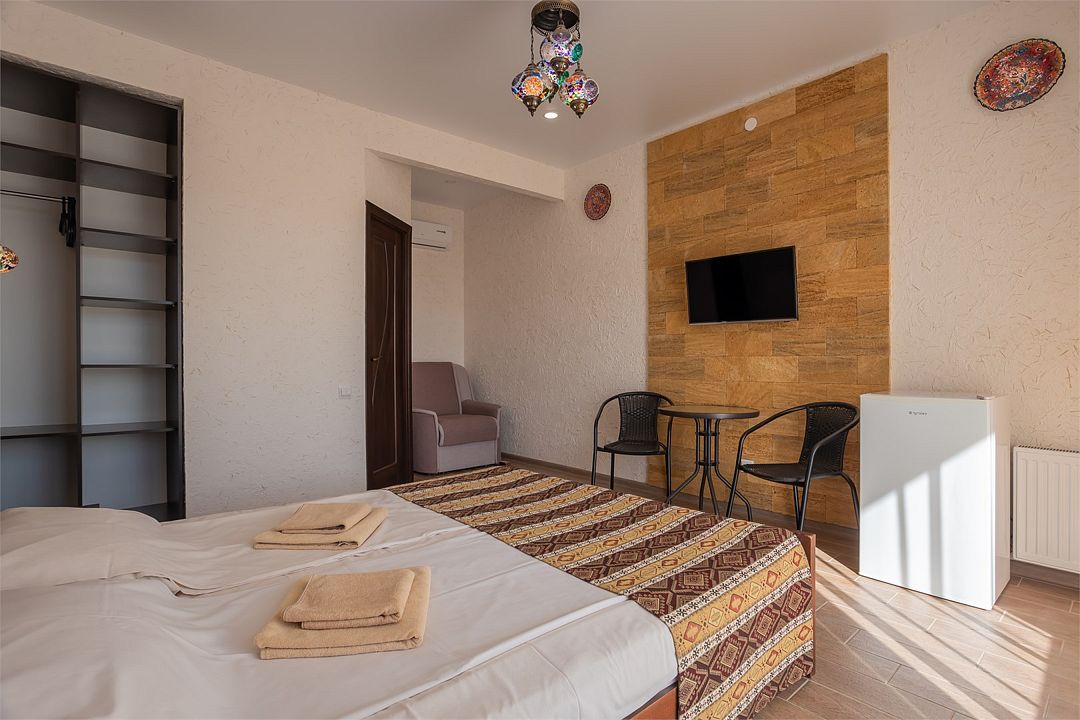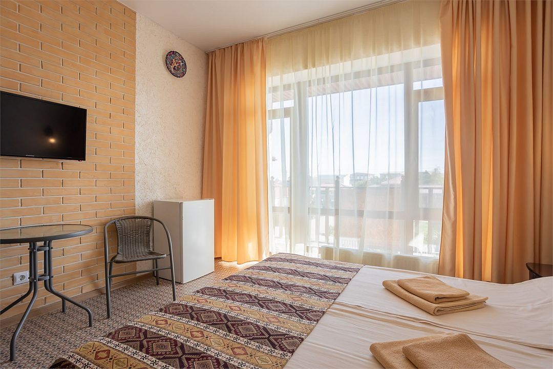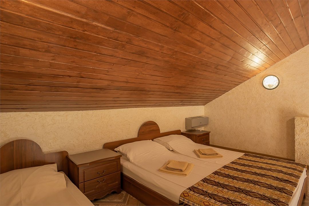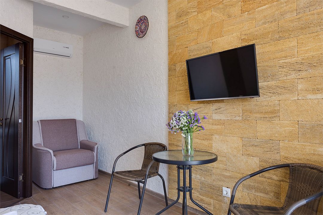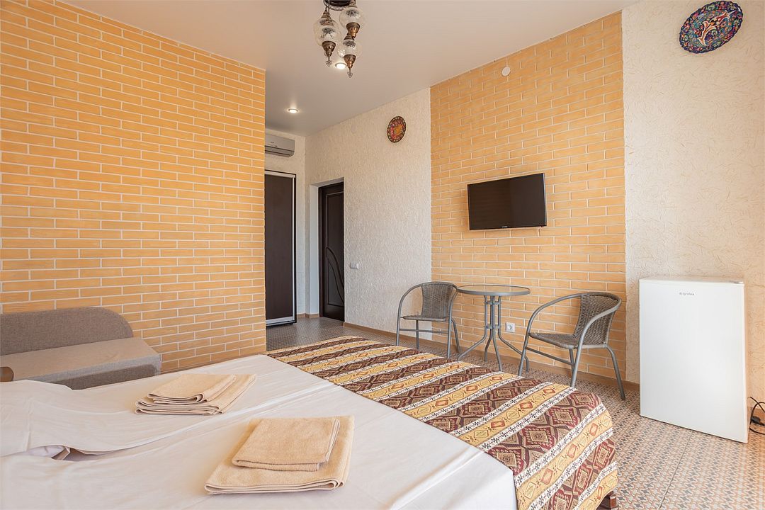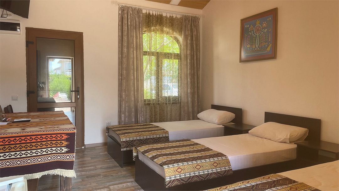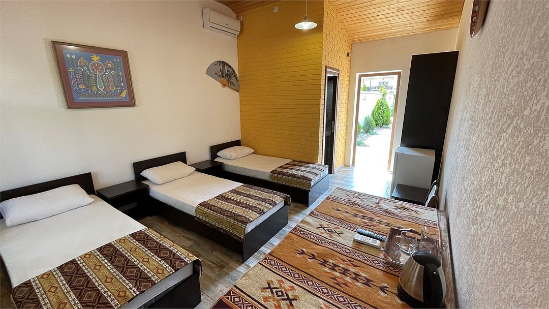 Номер Трехместный Стандарт включает в себя ванную комнату, которая оборудована самыми современными удобствами. Телевизор, холодильник, кондиционер. Отдельный вход. В номере три раздельные односпальный кровати.Услуги и удобства