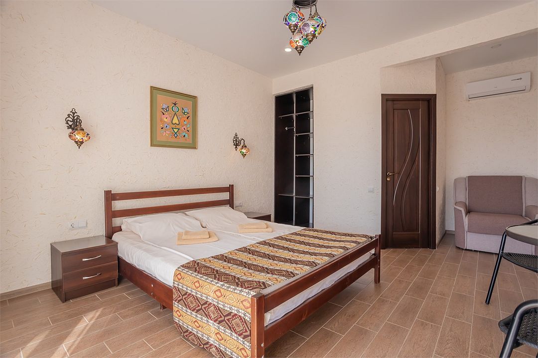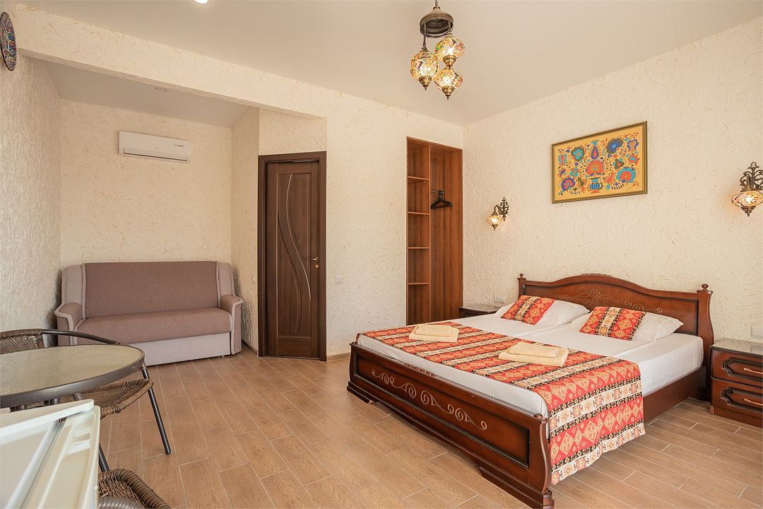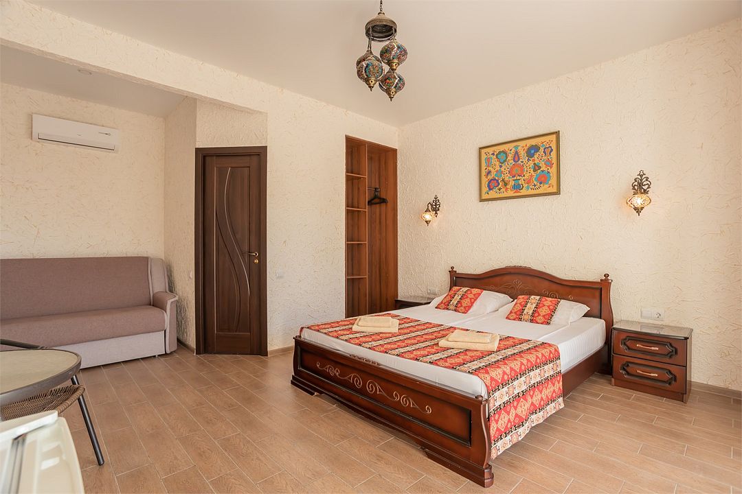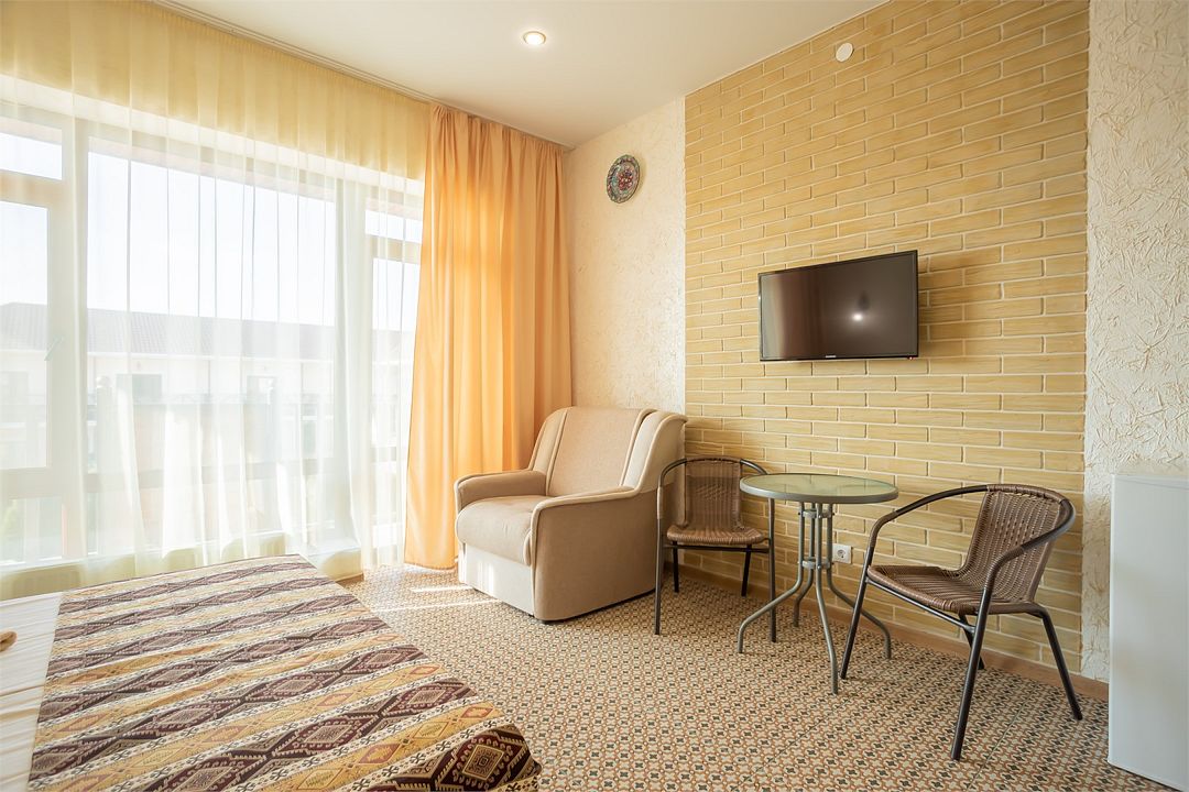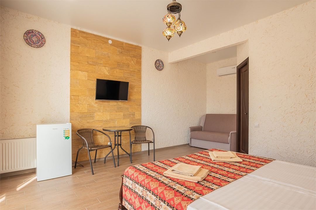Wi-Fi, холодильник, кондиционер, светильник, фен, утюг, санузел, банные принадлежности, балкон, кровать «Queen size», шкаф для одежды, отдельный вход в номер, душ, туалетные средства, панорамные окна, диван-кровать, раскладной диван, телевизор с плоским экраном, без питомцевВ гостиничном номере