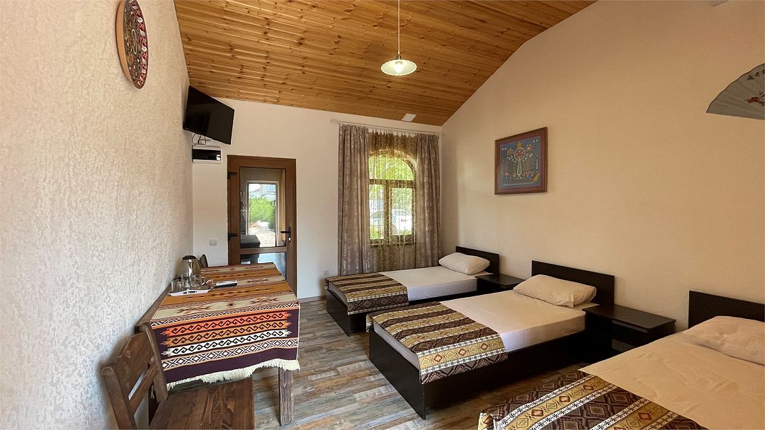 телевизор, Wi-Fi, холодильник, фен, стулья, шкаф для одежды, зеркало, чайник, унитаз, отдельный вход в номер, душ, три односпальные кровати, вид во двор, стол, тумба, туалет, сушилка для белья, мыло, открытый шкаф, без питомцевВ гостиничном номере