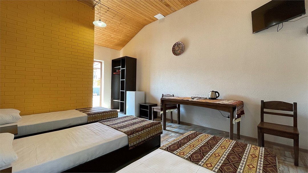 телевизор, Wi-Fi, холодильник, фен, стулья, шкаф для одежды, зеркало, чайник, унитаз, отдельный вход в номер, душ, три односпальные кровати, вид во двор, стол, тумба, туалет, сушилка для белья, мыло, открытый шкаф, без питомцевВ номере