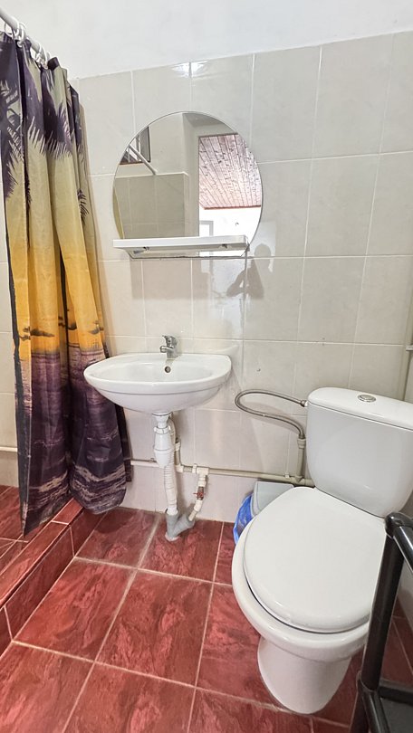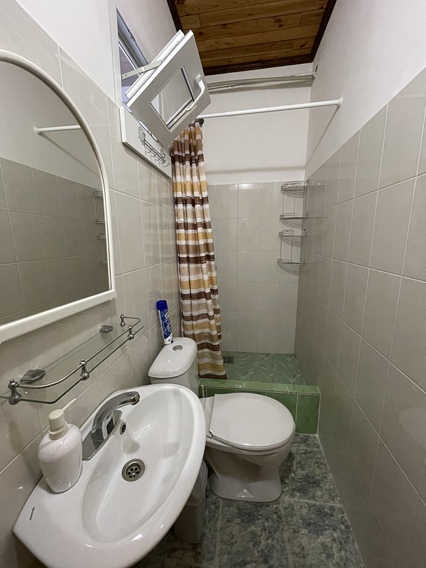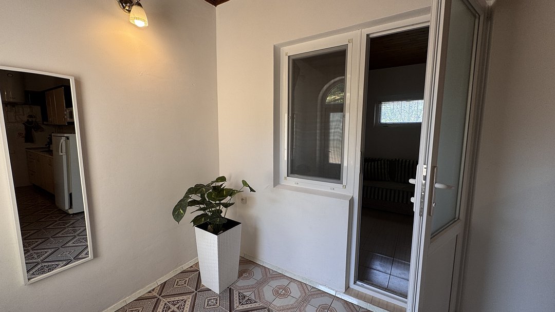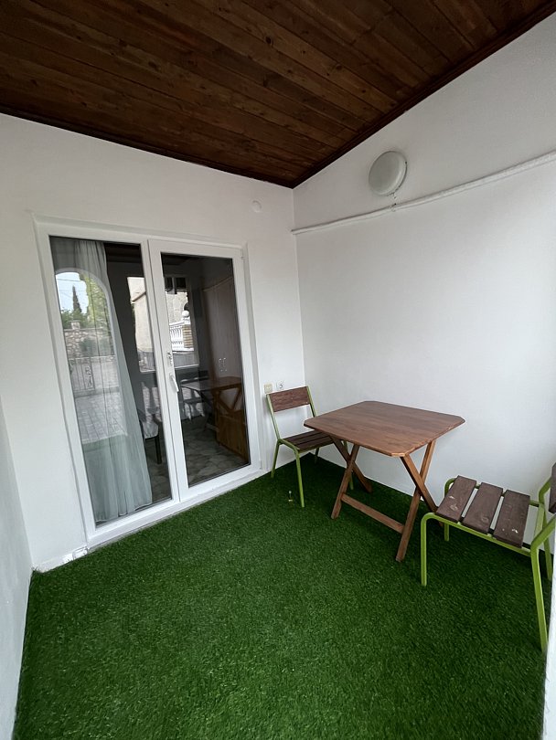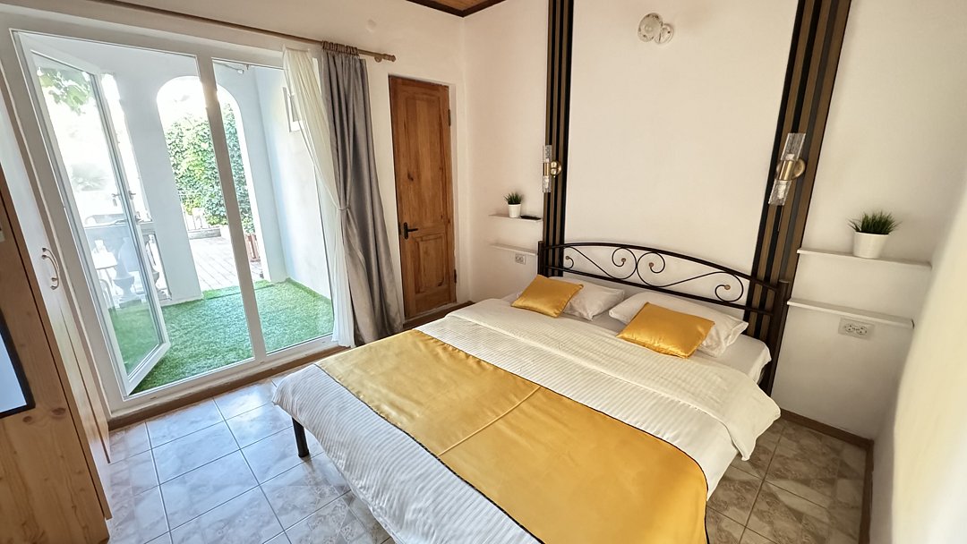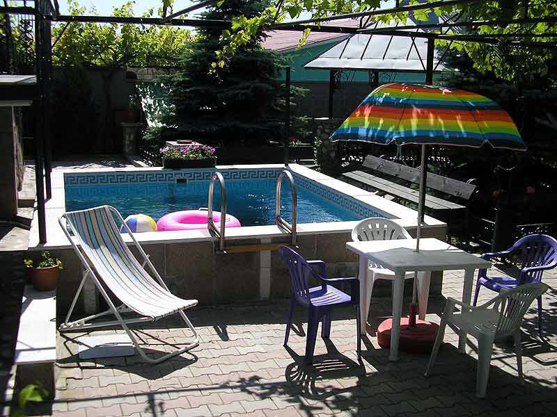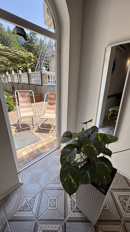 Отдельный вход с уютной террасой, украшенной живыми цветами в вазонах. На террасе – деревянная дачная мебель (стол и стулья), здесь вы можете отдыхать, спрятавшись от горячих солнечных лучей и уютно устроившись в кресле с прохладительным напитком. Перед входом – шезлонги для принятия солнечных ванн, сушилка для белья.