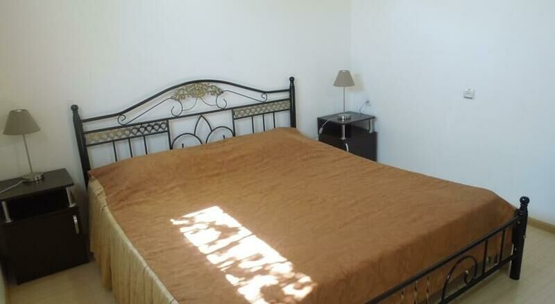 В номере: 2-х спальная деревянная кровать с ортопедическим матрацем, 2 тумбочки со светильниками, шкаф, банкетки, плазменный телевизор, холодильник, электрочайник и набор необходимой посуды (тарелки, стаканы, ложки, вилки). На территории есть WI-FI.