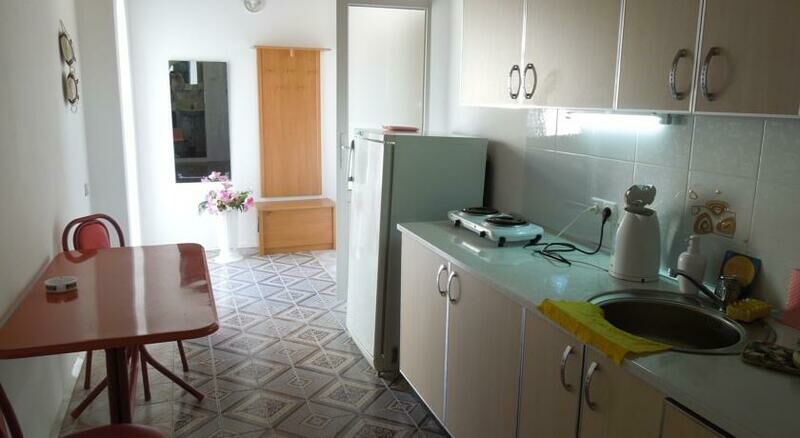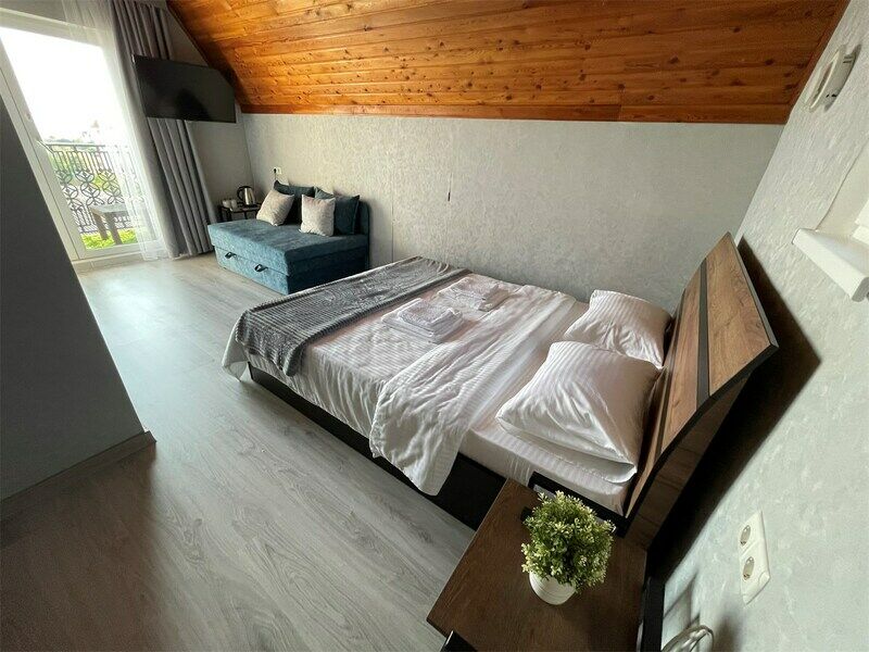 В номере: одна 2-спальная кровать с ортопедическим матрацем, раскладывающийся диван, 2 тумбочки со светильниками, холодильник, электрочайник и набор необходимой посуды (тарелки, стаканы, ложки, вилки), плазменный ТВ, своя лоджия со столом и стульями, санузел. На территории есть WI-FI.