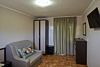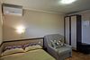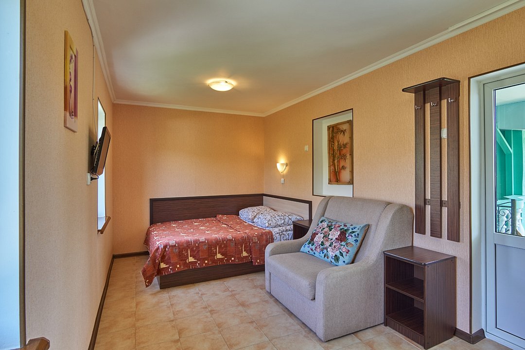 В комнате есть все необходимое: мебель, телевизор, кондиционер и санузел с душем. Для сна предусмотрены кровать размером 160х190 см и кресло-кровать 80х190 см.