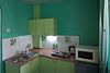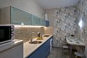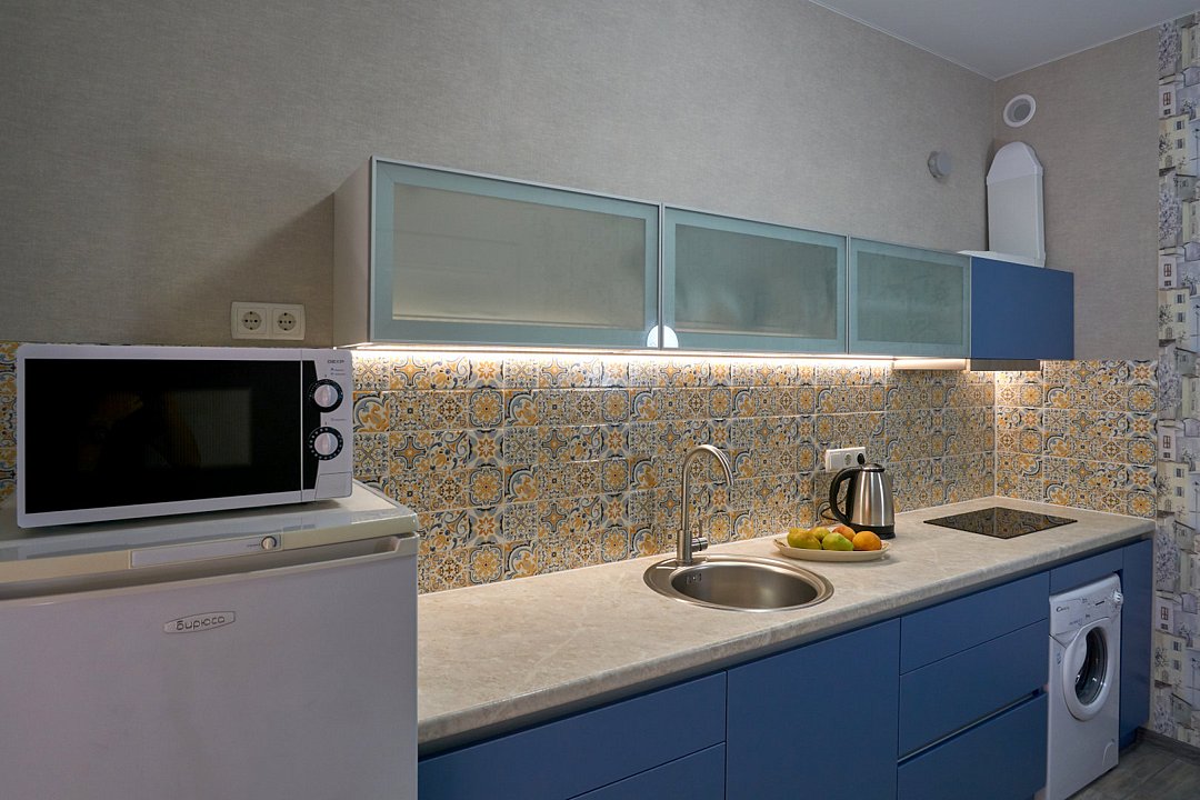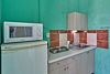 На балконе расположена мини-кухня с холодильником, микроволновой печью и двухкомфорочной электрической плитой. Также есть посуда, обеденный стол и стулья, а также сушилка для белья.
