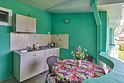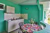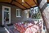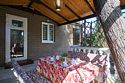 На кухне установлена современная техника (холодильник, микроволновая печь, двухконфорочная индукционная плита, вытяжка), а также посуда. Кроме того, в кухне есть стиральная машина. Из домика ведут два отдельных выхода: один в беседку, другой на улицу.