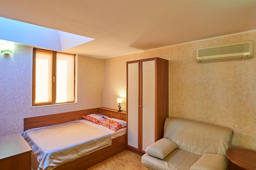 В комнате имеется вся необходимая мебель, телевизор, кондиционер и санузел с душем. Для сна предусмотрены кровать размером 140х190 и кресло-кровать 80х190.