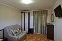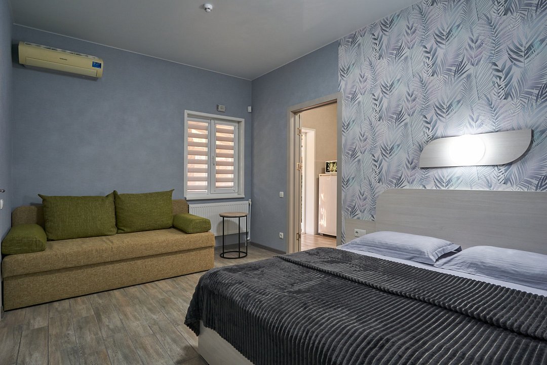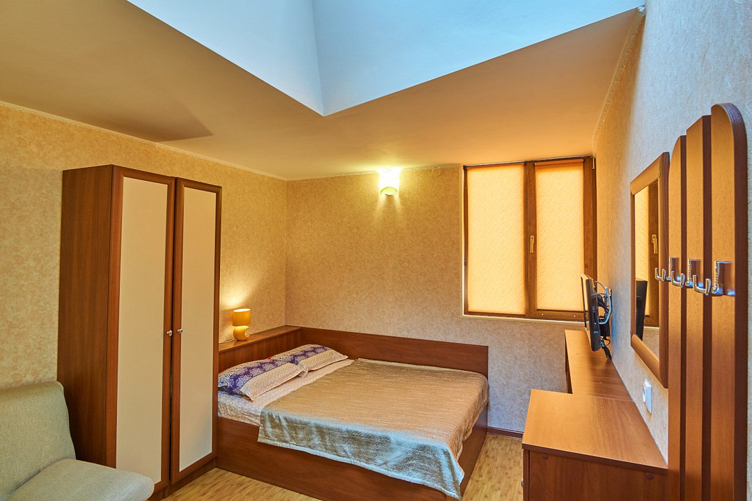 В комнате: необходимая мебель, телевизор, кондиционер, сан.узел с душем. Спальные места: кровать — 140х190 и небольшой раскладной диван — 90х190.