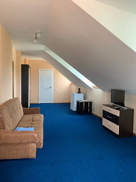 Оборудование: телевизор, спутниковое, цифровое тв, кухня в номере, холодильник, кондиционер, фен, электрочайник, халат, тапочки, средства личной гигиены Удобства: туалет и душ в номере, санузел совмещенный Мебель: 1 двуспальная кровать, 1 диван-кровать, 1 кресло-кровать, детская кроватка (по запросу)В гостиничном номере