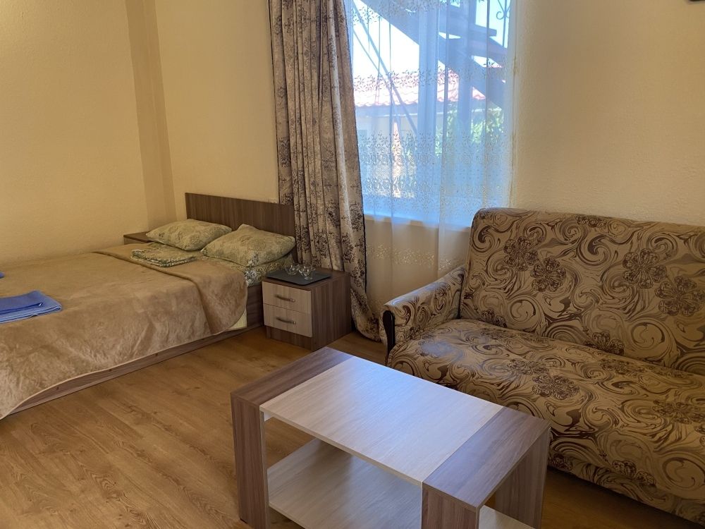 Оборудование: телевизор, спутниковое, цифровое тв, холодильник, кондиционер, фен, электрочайник, средства личной гигиены Удобства: туалет и душ в номере, санузел совмещенный Мебель: 1 двуспальная кровать, 1 односпальная кровать, 1 диван-кровать, детская кроватка (по запросу) Дополнительно: С видом на бассейн и на море Полулюкс двухкомнатный есть 2.Один номер с мебельной перегородкой с видом на море и на бассейн(№23).Возле номера терраса со столом и со стульями. Второй номер( №17)видом на палисадник с двумя смежными , раздельными комнатами.Возле номера терраса со столом и со стульями.В гостиничном номере