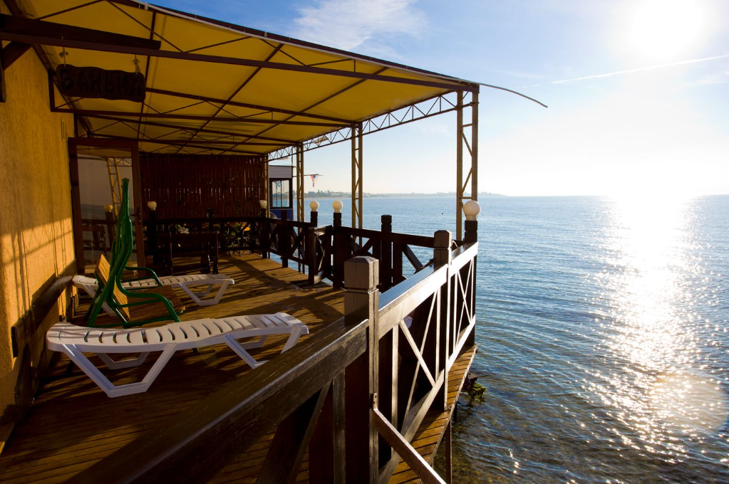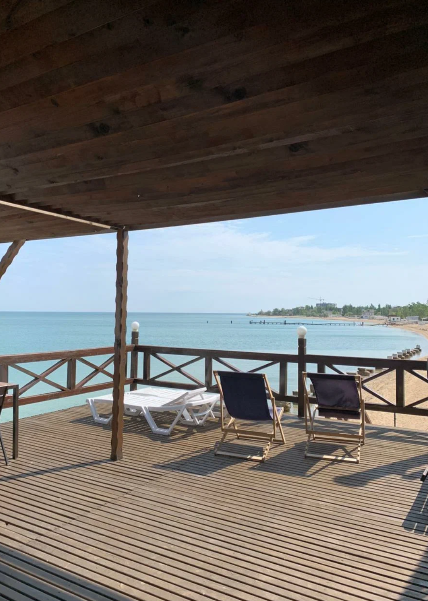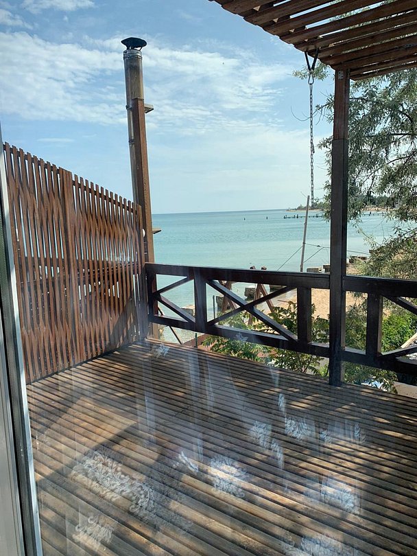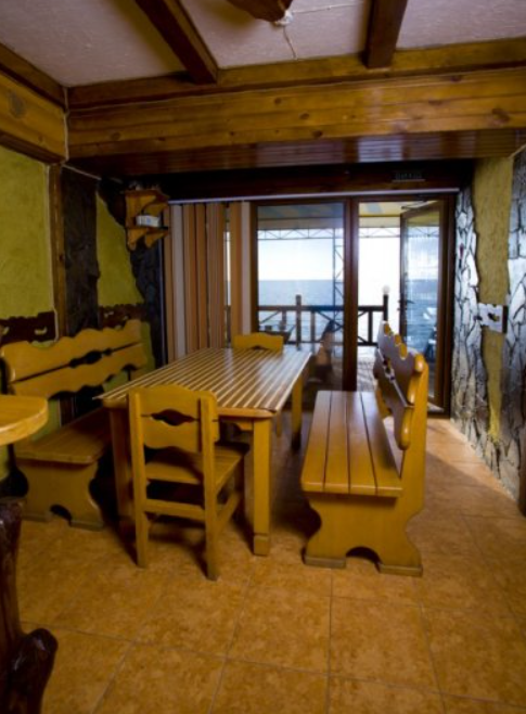Просторная комната отдыха, где свободно могут разместится 6 и более человек, располагает к приятному отдыху с чашкой ароматного травяного чая или холодного напитка, глядя как за стеклянной стеной катятся волны Черного моря… Как же здорово после 100°C окунуться в ледяную воду! Именно для этих целей предусмотрен выход из баньки сразу же в море!!! От дверей до кромки воды меньше 6 метров, и эти метры — деревянные настил и лестница с мостиком прямо в воду!