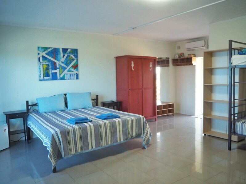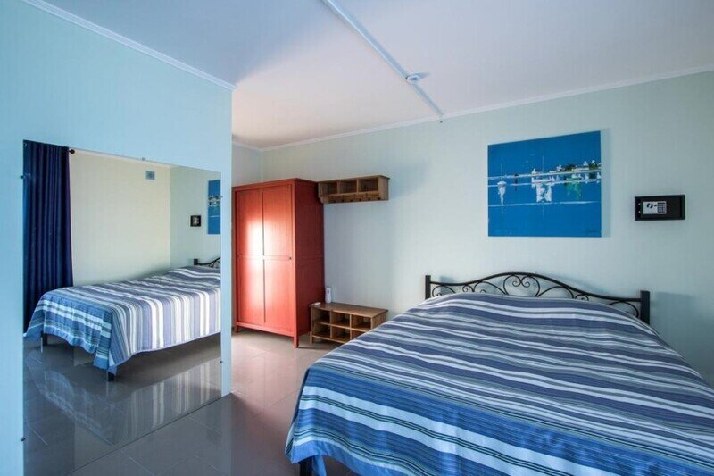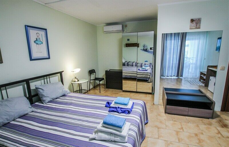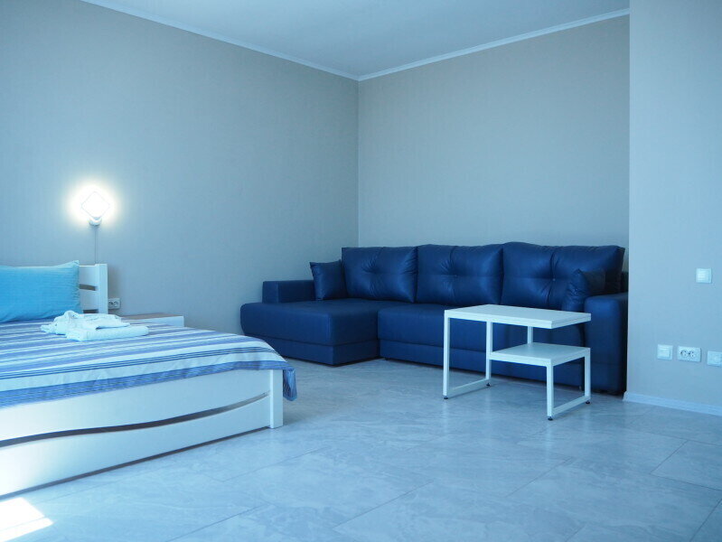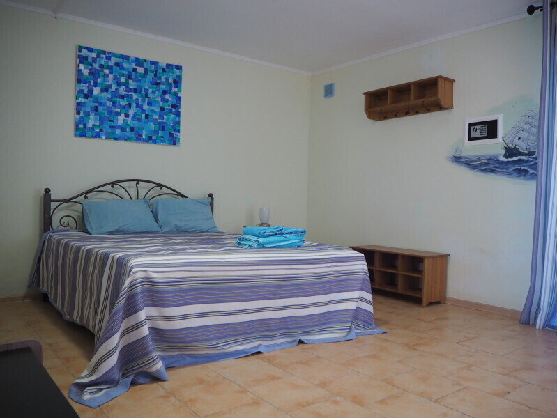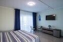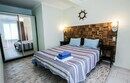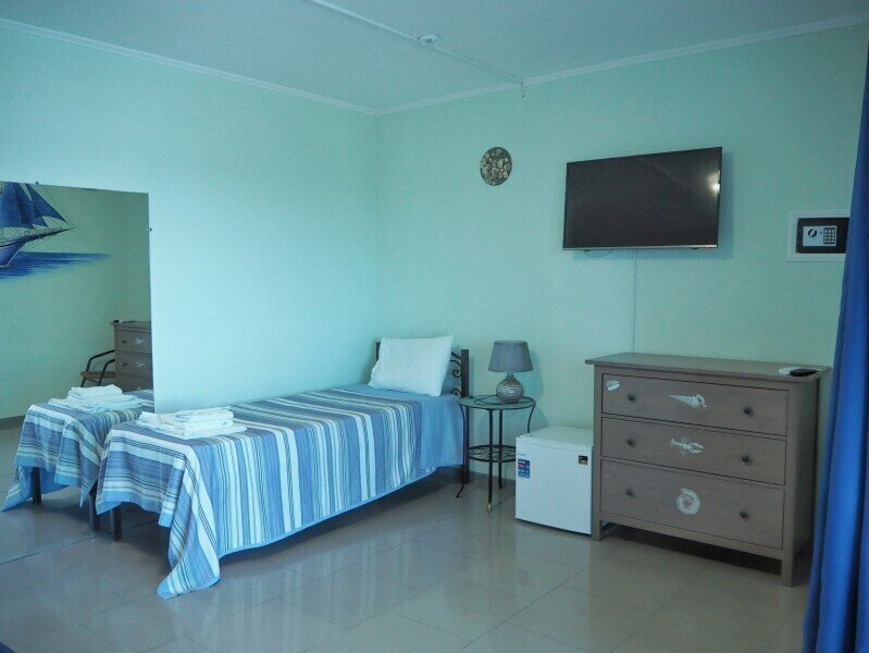 Просторный номер для двоих с большой кроватью и видом на море. Есть номера с раздельными кроватями.