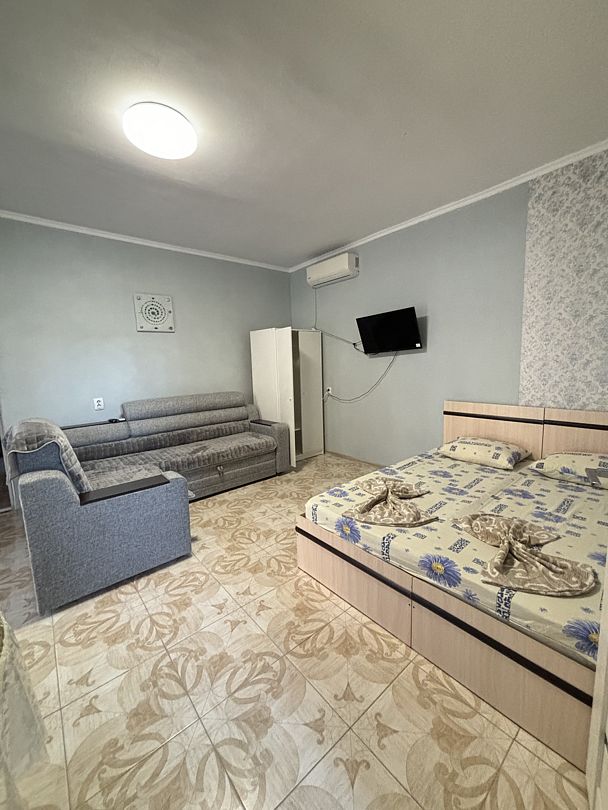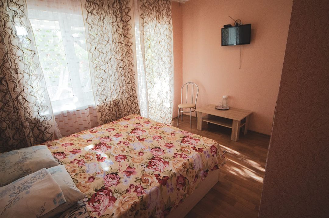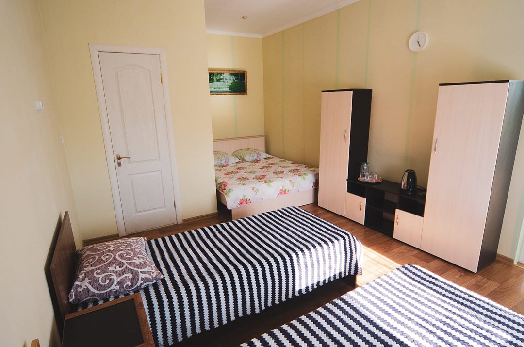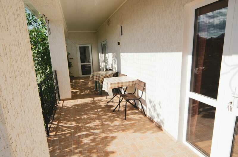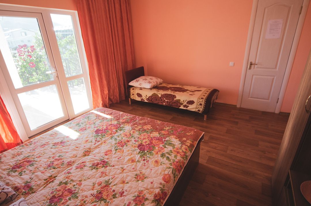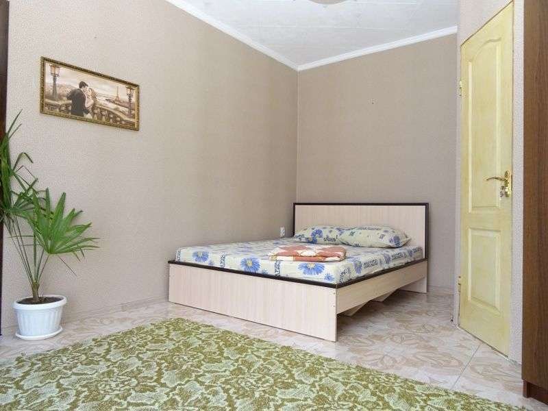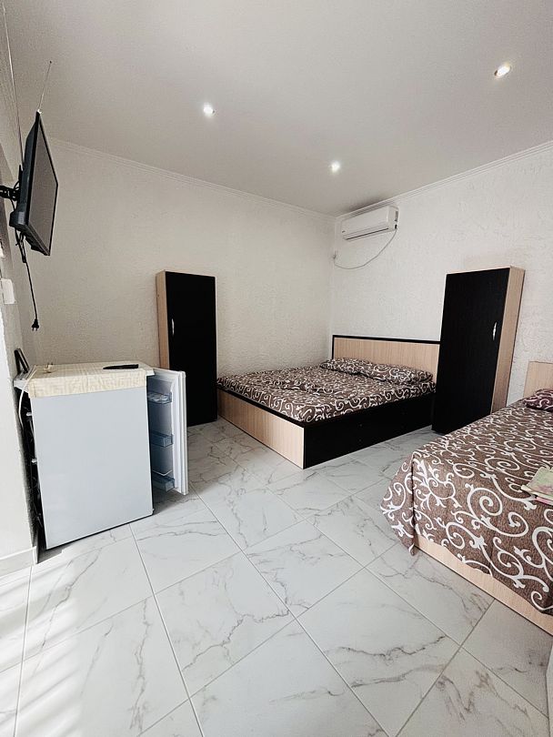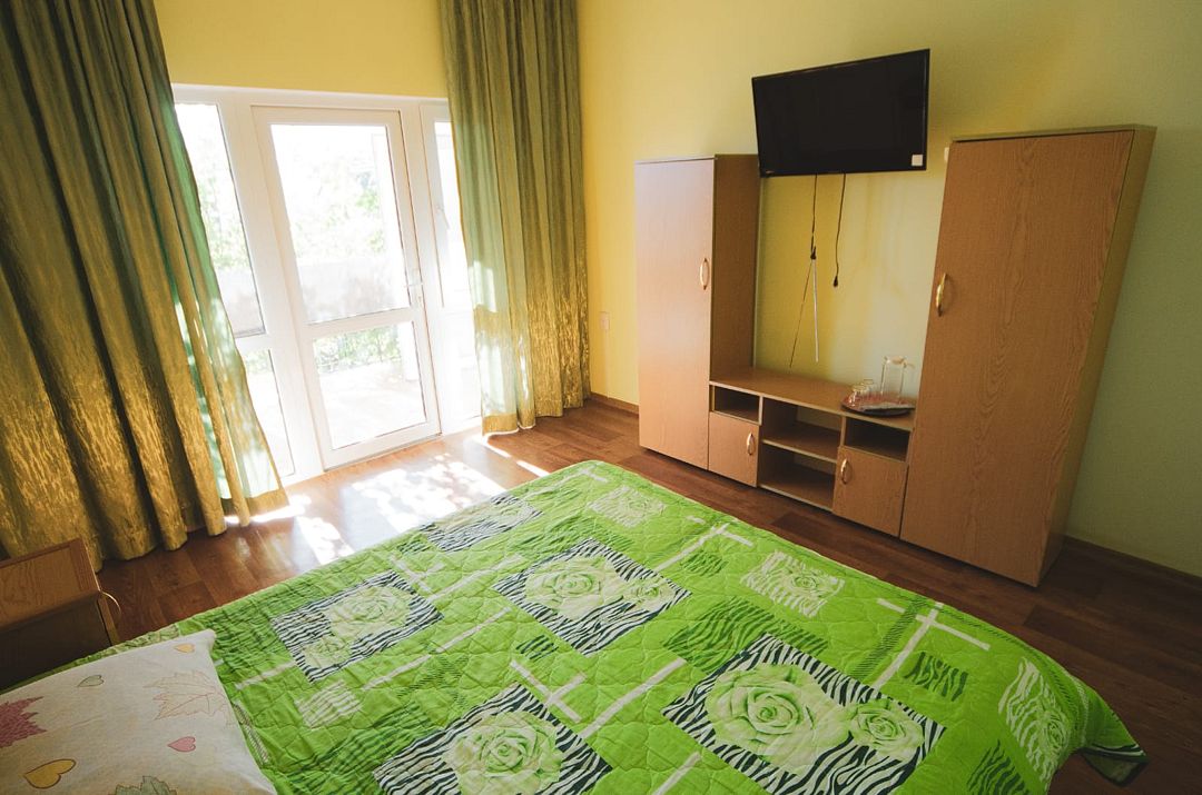 В гостевом доме находятся два здания. В двухэтажном здании на 2м этаже расположены просторные 2-х и 3-х - местные номера и комната-студио с огромными витражными окнами. В каждом номере есть необходимая мебель, санузел с душевой кабинкой, телевизор, кондиционер, интернет. В номере-студио еще и своя кухня с необходимой техникой и инвентарем. На 1-м этаже находятся 2-х комнатные семейные номера с холодильником, необходимой мебелью, санузел с душевой кабинкой, телевизор, кондиционер, интернет. На балконах столики для приема пищи. На этом же этаже имеется 3х местный номер без удобств. В номере имеются кровати, вентилятор, вешалка. Номер просторный и прохладный. Санузел расположен во дворе, раздельный, в душе - круглосуточно горячая вода.