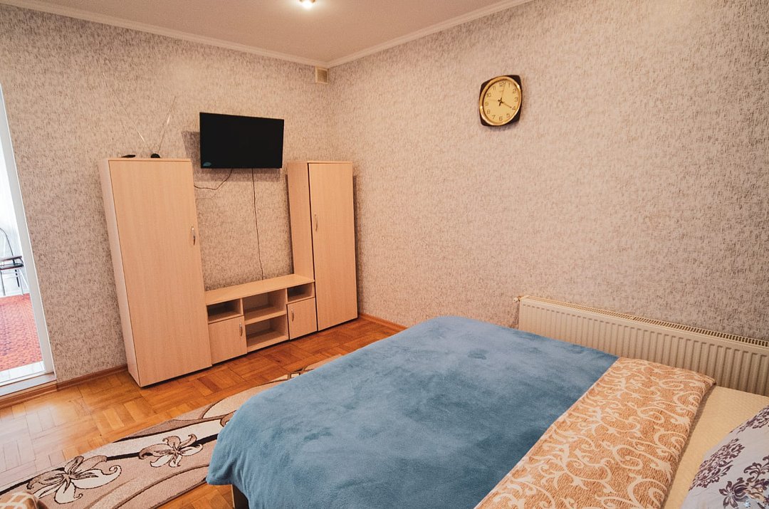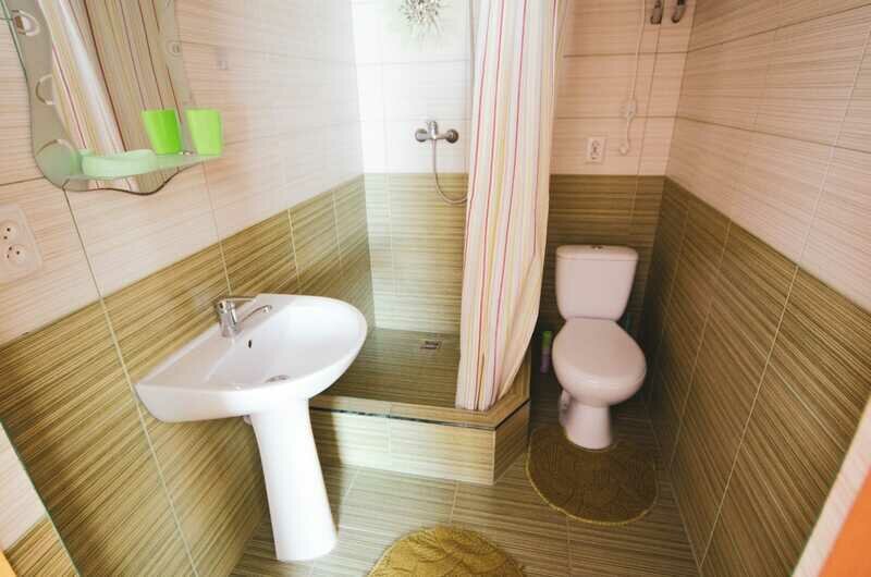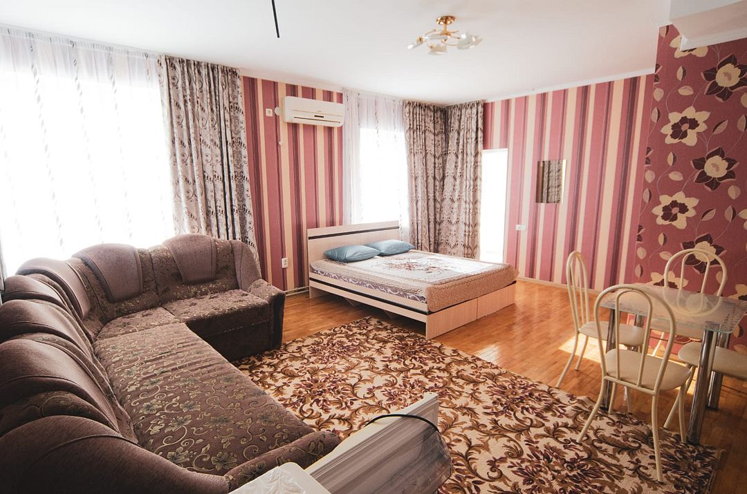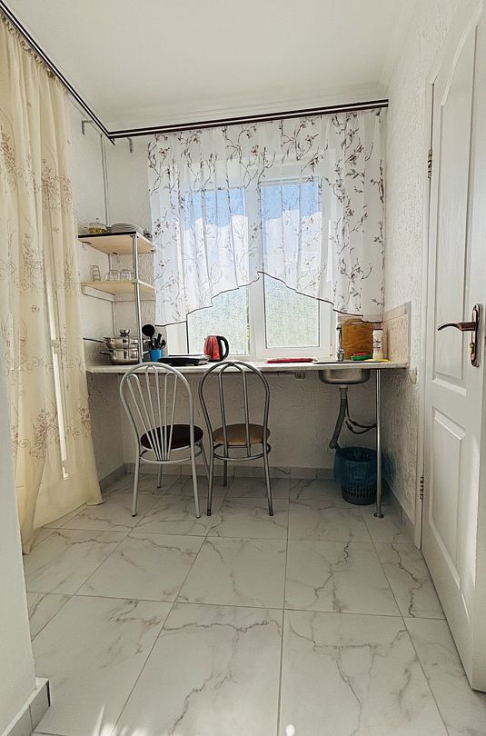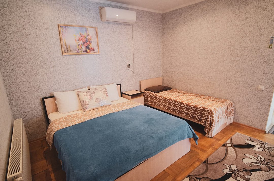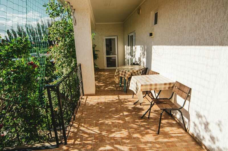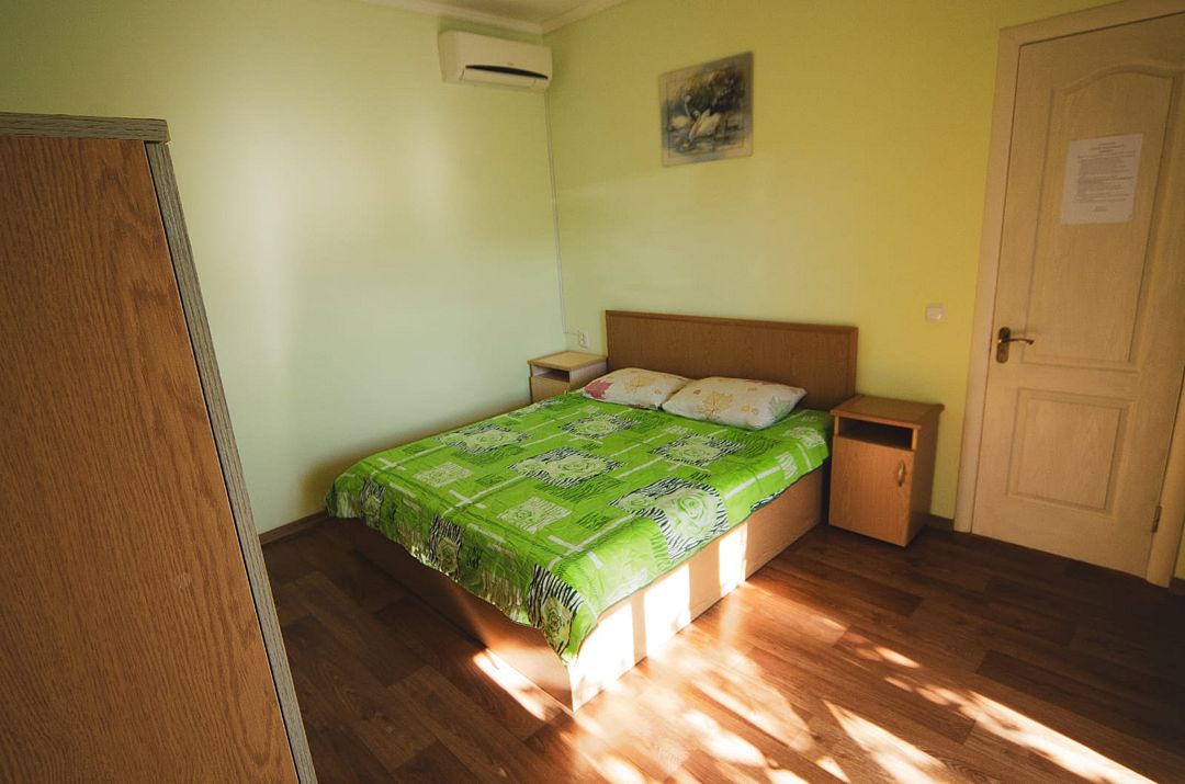 В гостевом доме находятся два здания. В двухэтажном здании на 2м этаже расположены просторные 2-х и 3-х - местные номера и комната-студио с огромными витражными окнами. В каждом номере есть необходимая мебель, санузел с душевой кабинкой, телевизор, кондиционер, интернет. В номере-студио еще и своя кухня с необходимой техникой и инвентарем. На 1-м этаже находятся 2-х комнатные семейные номера с холодильником, необходимой мебелью, санузел с душевой кабинкой, телевизор, кондиционер, интернет. На балконах столики для приема пищи. На этом же этаже имеется 3х местный номер без удобств. В номере имеются кровати, вентилятор, вешалка. Номер просторный и прохладный. Санузел расположен во дворе, раздельный, в душе - круглосуточно горячая вода.
