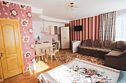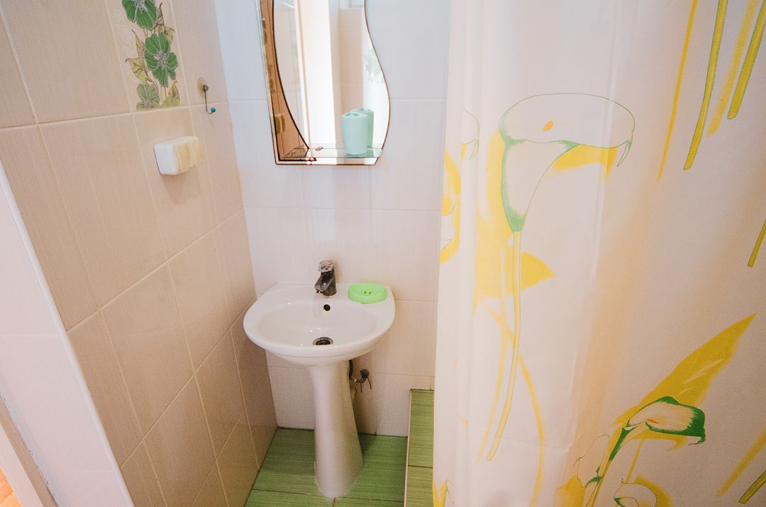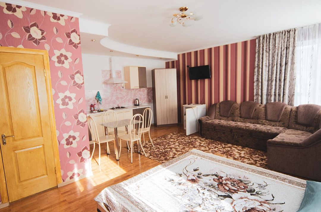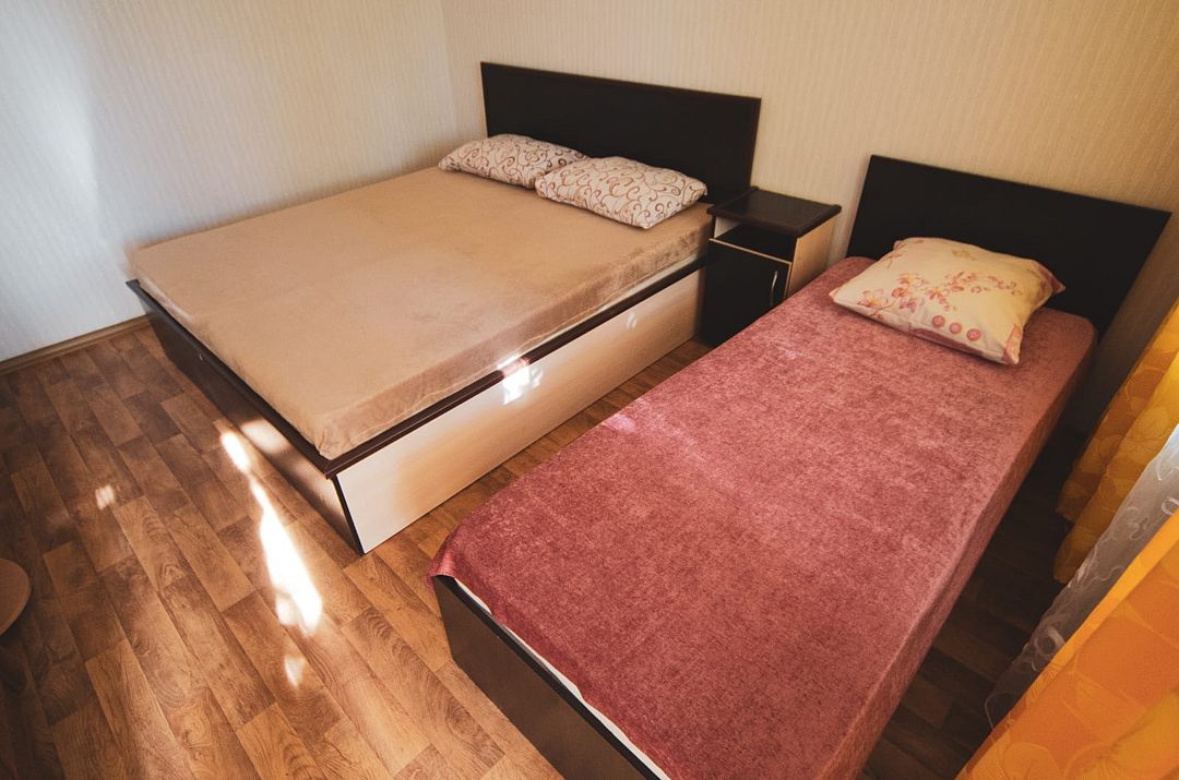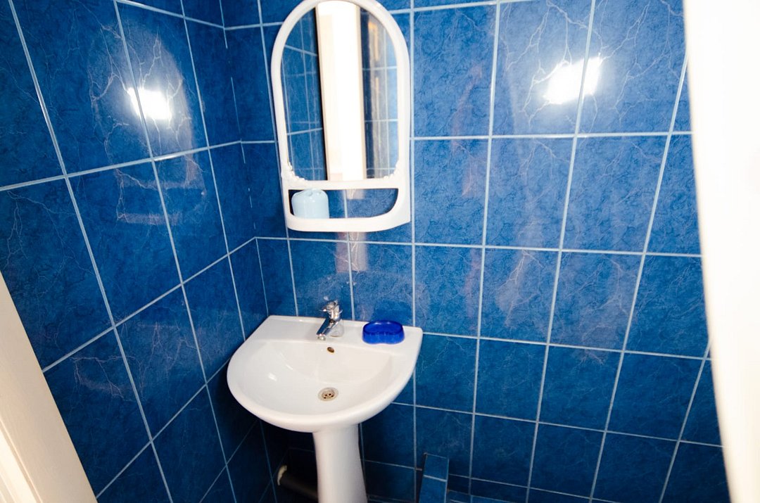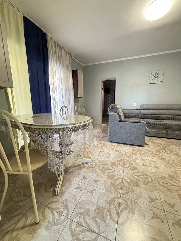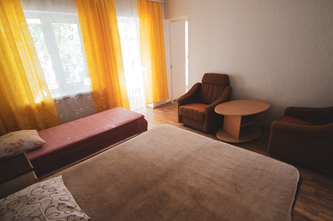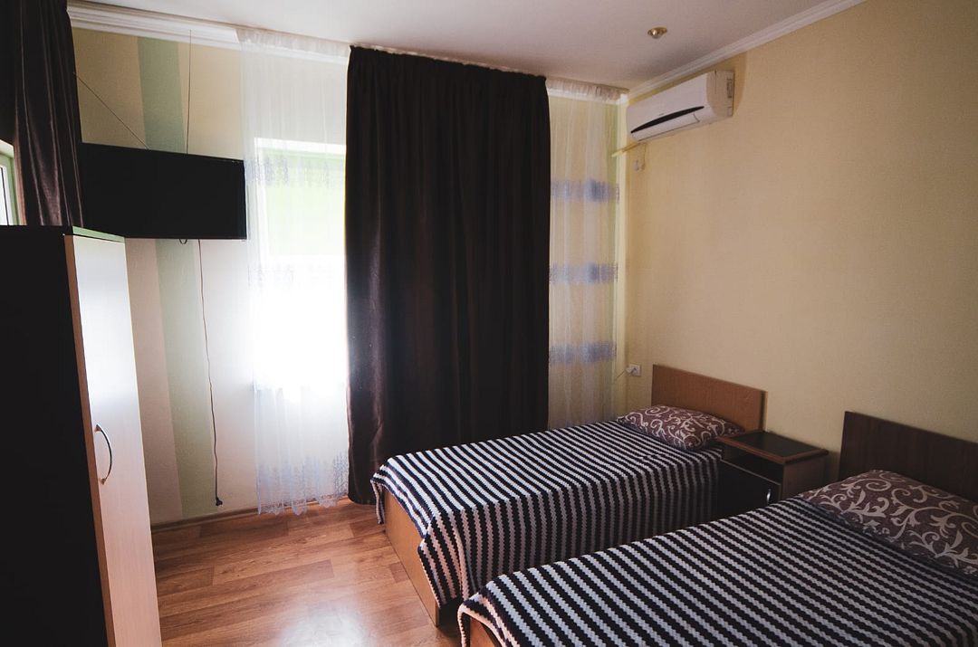 В гостевом доме находятся два здания. В двухэтажном здании на 2м этаже расположены просторные 2-х и 3-х - местные номера и комната-студио с огромными витражными окнами. В каждом номере есть необходимая мебель, санузел с душевой кабинкой, телевизор, кондиционер, интернет. В номере-студио еще и своя кухня с необходимой техникой и инвентарем. На 1-м этаже находятся 2-х комнатные семейные номера с холодильником, необходимой мебелью, санузел с душевой кабинкой, телевизор, кондиционер, интернет. На балконах столики для приема пищи. На этом же этаже имеется 3х местный номер без удобств. В номере имеются кровати, вентилятор, вешалка. Номер просторный и прохладный. Санузел расположен во дворе, раздельный, в душе - круглосуточно горячая вода.