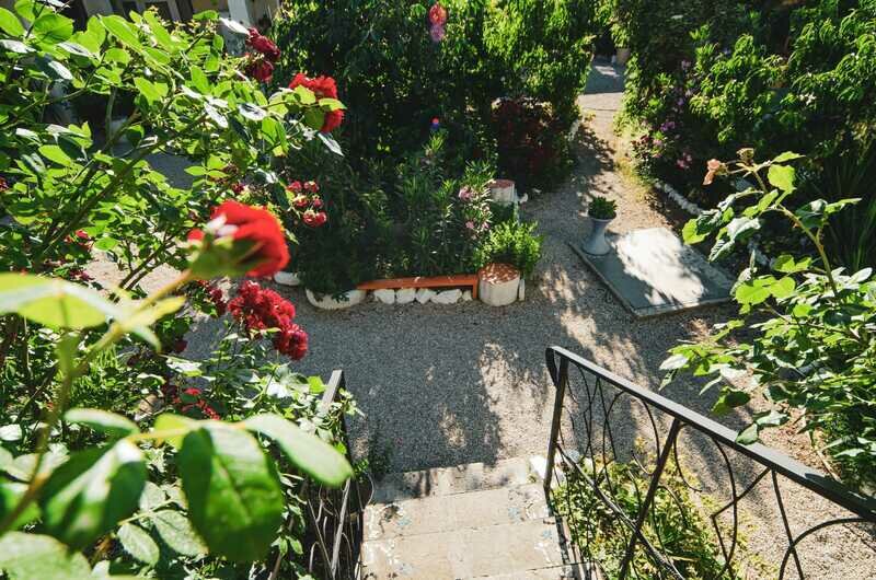 Во дворе можно отдохнуть в тени деревьев у каскадного фонтана. С начала мая и до глубокой осени двор наполнен благоуханием роз и других цветов. Фруктовые деревья и виноград по сезону радуют своим урожаем. Так же гости могут воочию увидеть как растет инжир, гранат и айва. Во дворе имеется парковка.