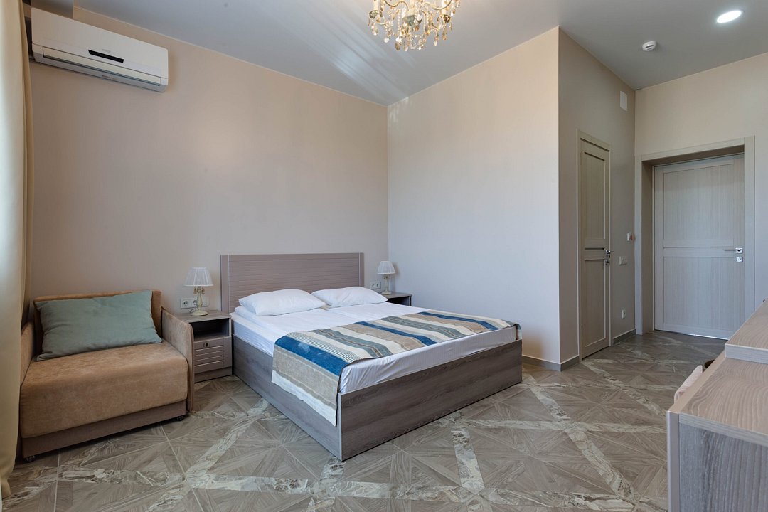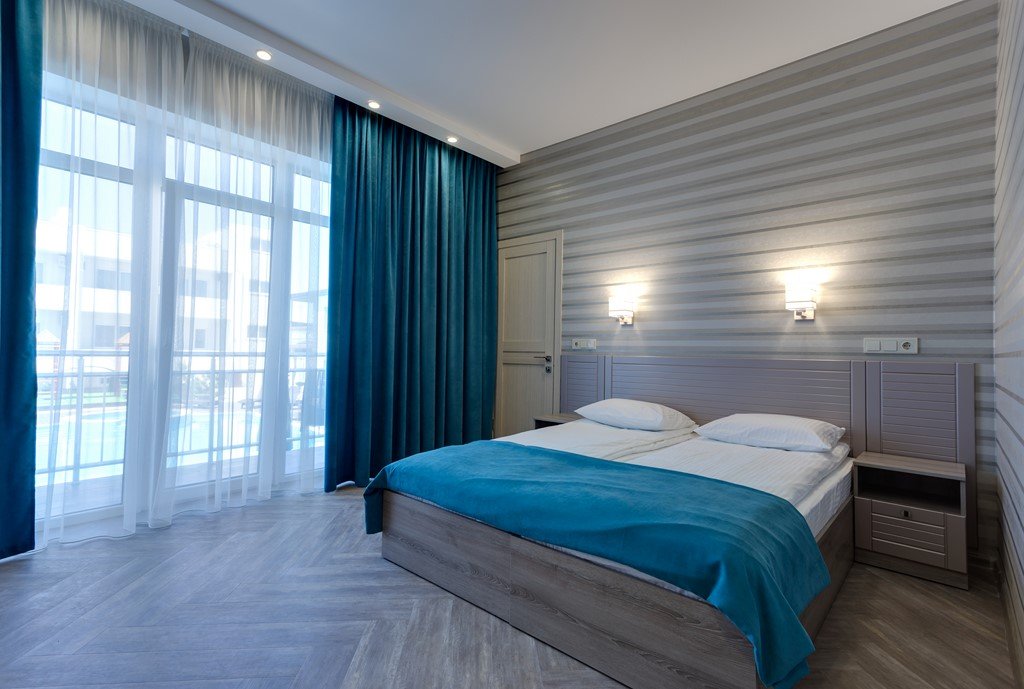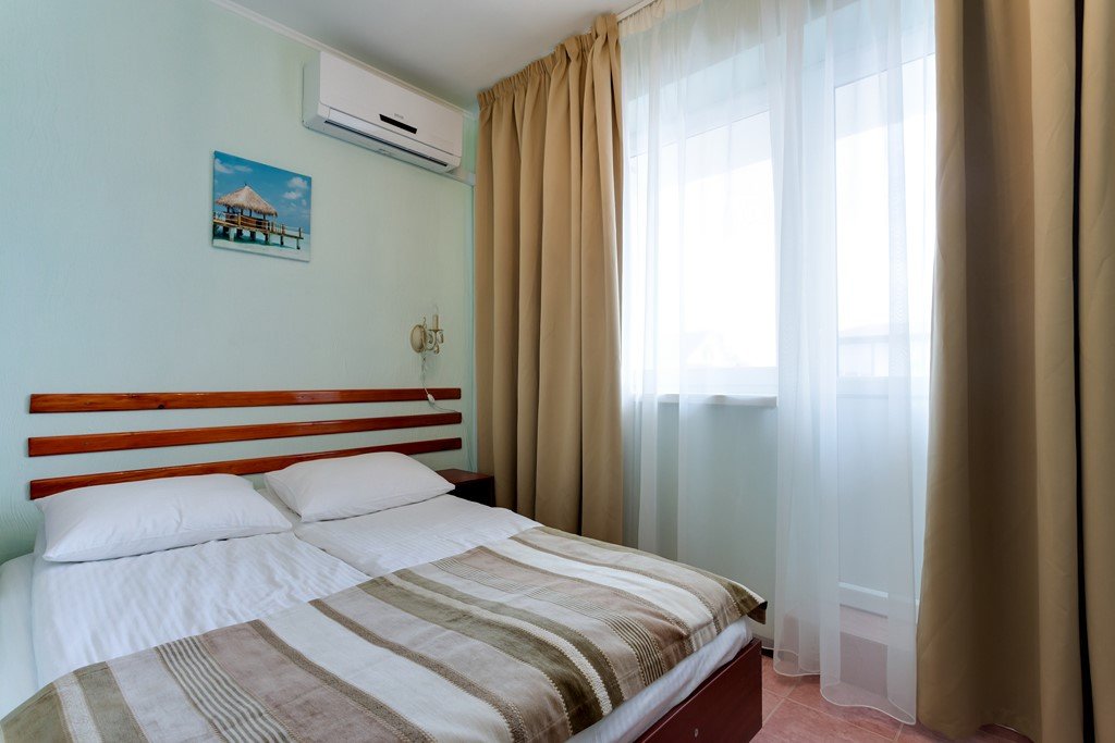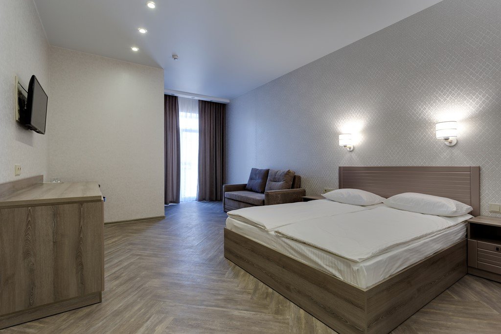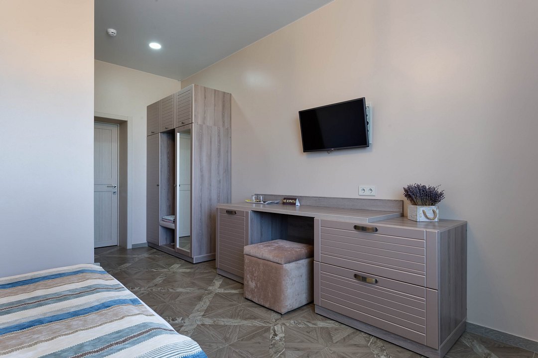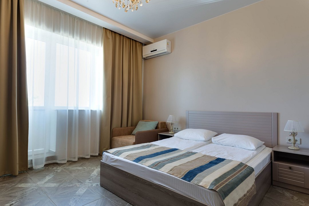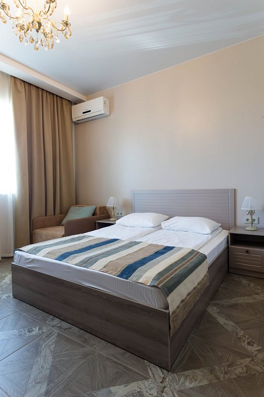 Номер «Standart» с отдельным входом с общей террасы расположен на втором этаже первого корпуса, с видом на бассейн. В комнате: гардероб, кондиционер, телевизор, холодильник, сейф. Санузел с душем, фен, комплект полотенец.