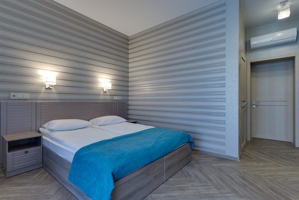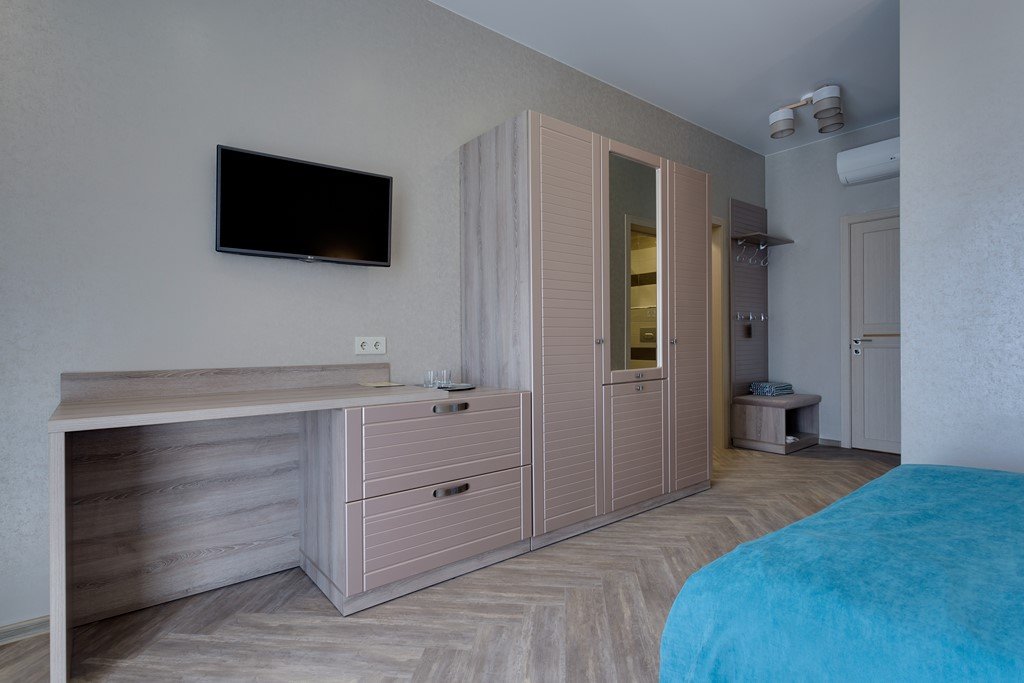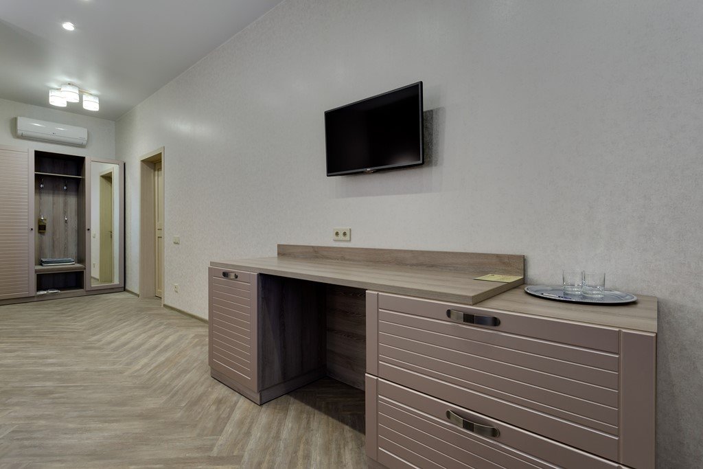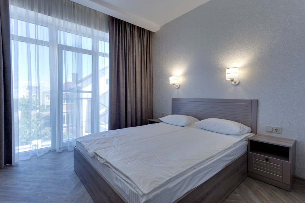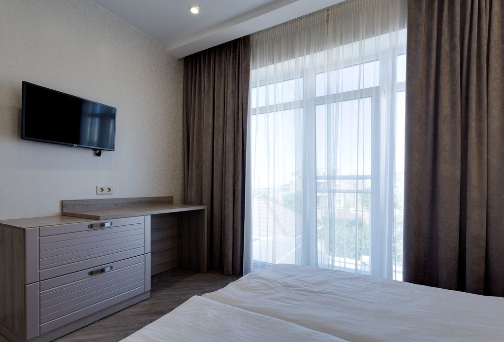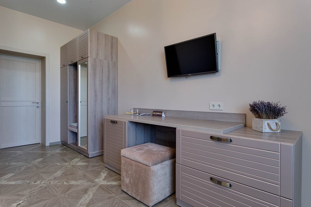 Номер «Standart» с отдельным входом с общей террасы расположен на втором этаже первого корпуса, с видом на бассейн. В комнате: гардероб, кондиционер, телевизор, холодильник, сейф. Санузел с душем, фен, комплект полотенец.